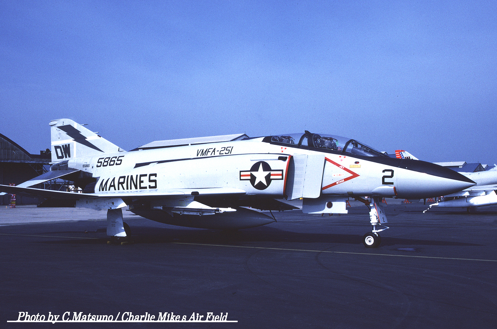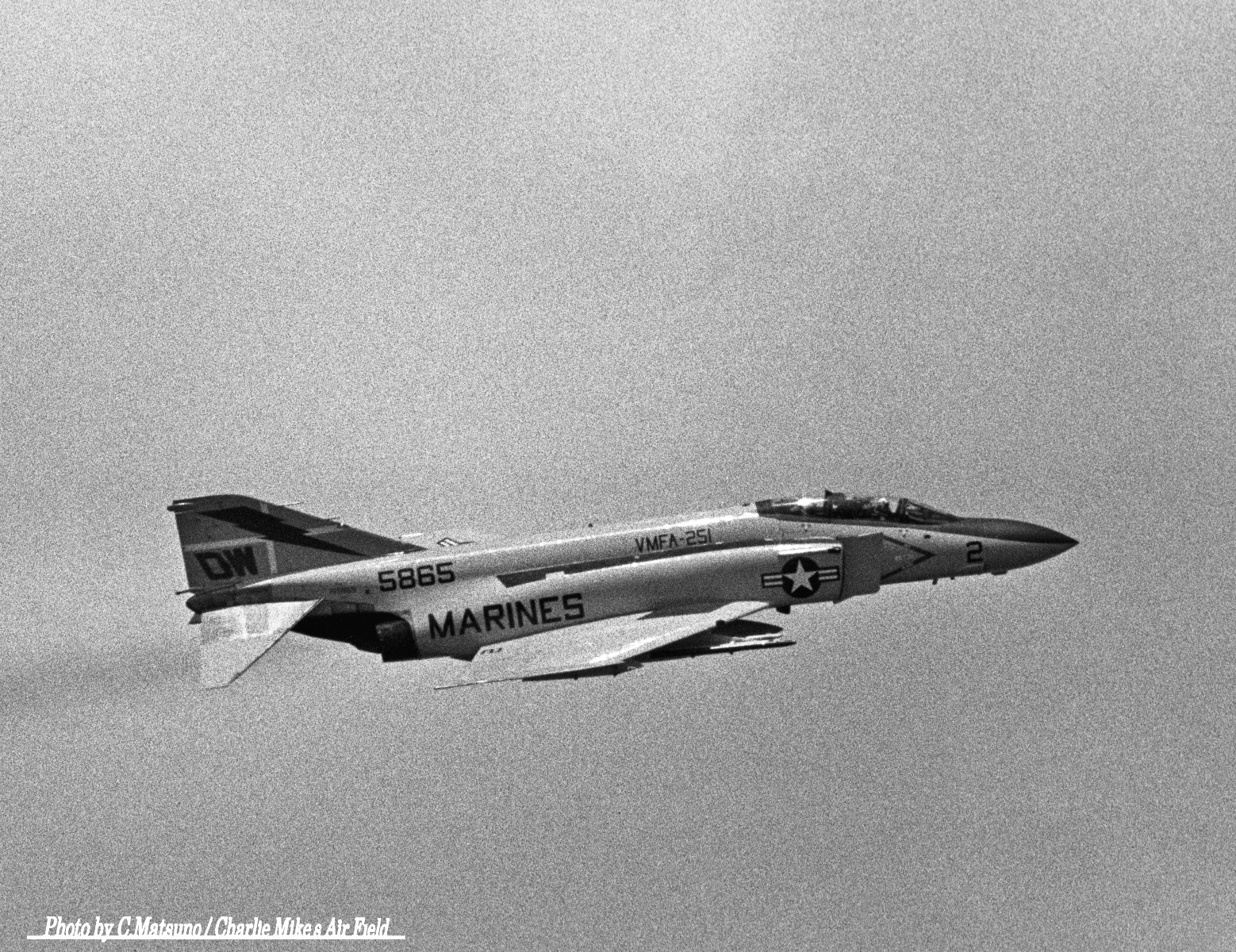 ↑ 1978年3月 冬のアルバイトで金を貯めて、天気の悪い3月の嘉手納基地に赴いた。お目当ての一つがこのVMFA-251のF-4Jを撮影する事だったが、残念だったのは尾翼をネービーブルーと赤い電光で塗った機体は既になく、全てグレー色に変っていた。