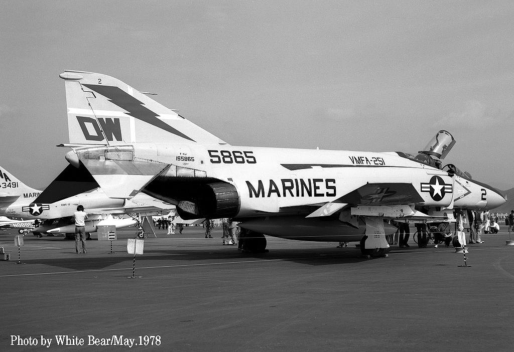 ↑ 同じく1978年5月にWhite Bearさんが岩国基地航空祭で撮影されたVMFA-251の同機。Modex-2/2号機は何故か”2”の記入位置が他の機体に比べレドームに近い位置に書かれており、文字体も大きい。コクピット周りの視界の反射を抑える黒いモヒカン塗装は、コックピット後方まで伸びているが、J型が完全なロービジへ移行する前の共通のパターンであった。