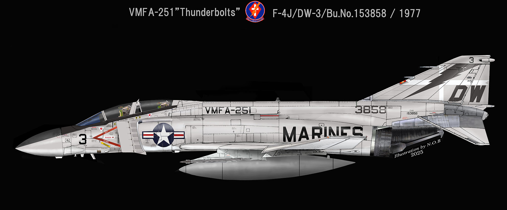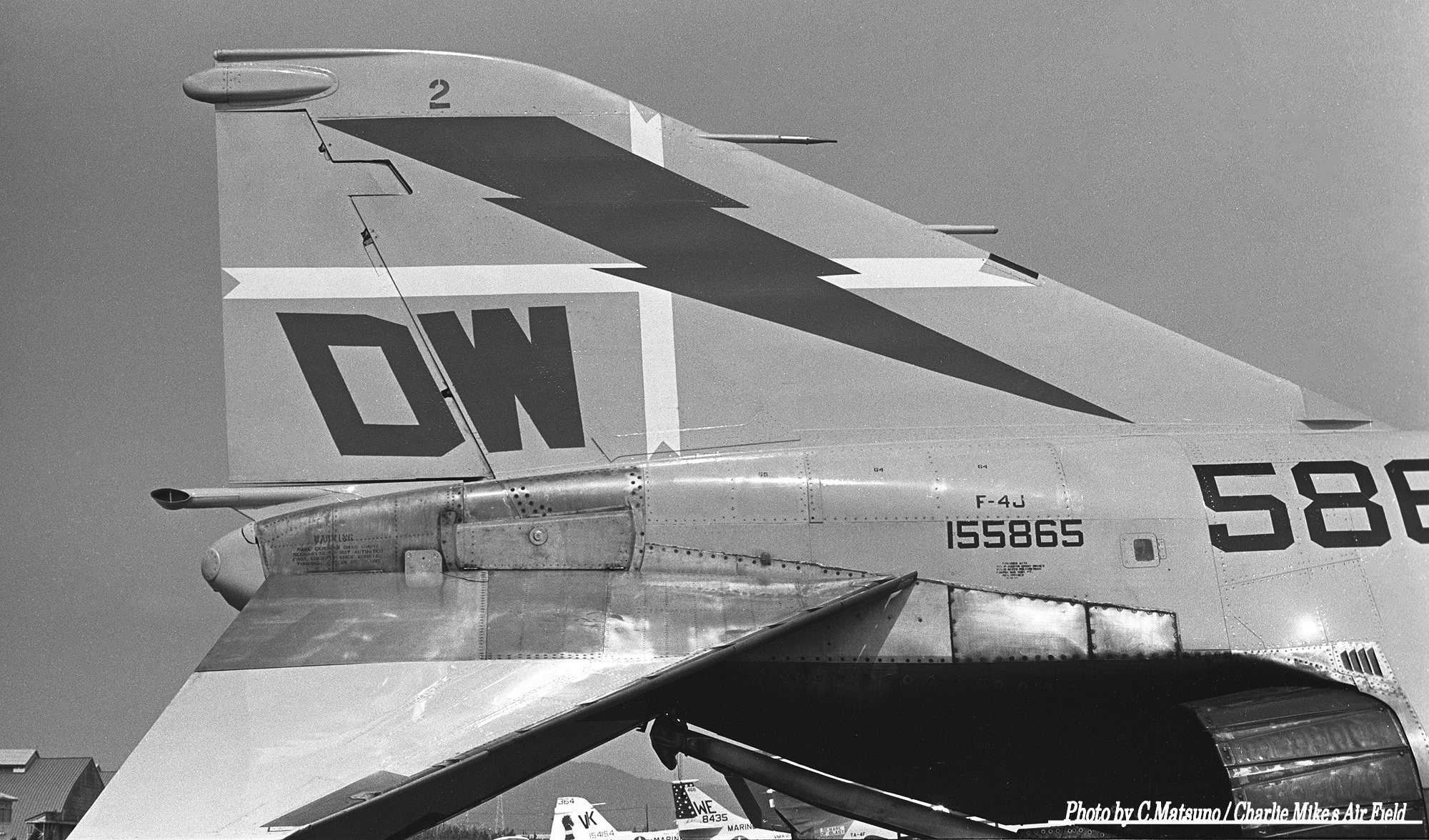 ↑1977年9月岩国基地に派遣された時に施されていたロービジタイプのマーキングで、日本到着時は数機が尾翼を紺色として白い十字架と赤い電光のカラーマーキングを残していたが、1978年当初には全てこのタイプに統一された。F-4J/DW-3/Bu.No.153858