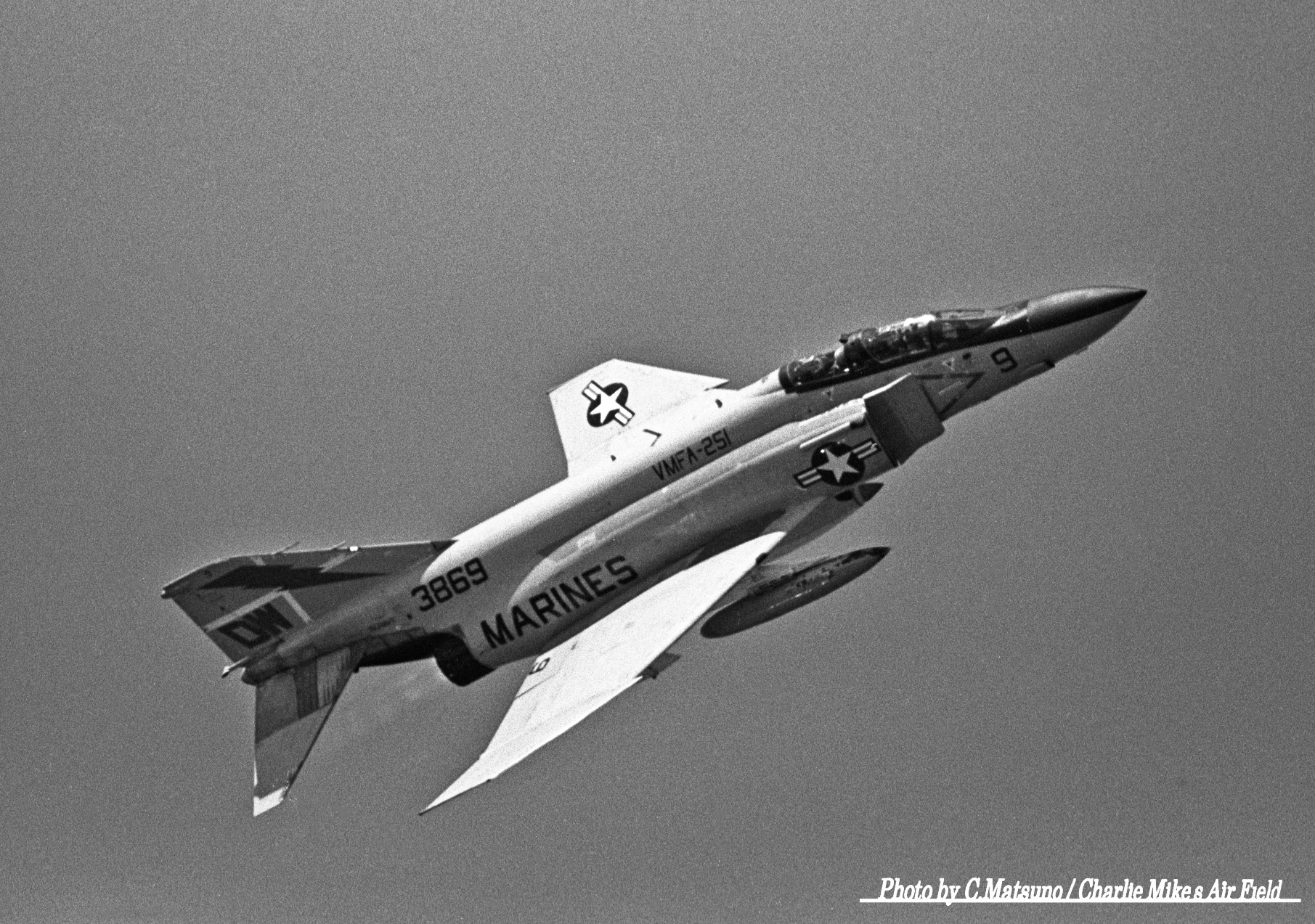 ↑ 1978年2月 松野主税氏が岩国基地へ赴き撮影されたVMFA-251のF-4J。フィルム時代で未だ望遠レンズも長玉等ほとんど無く、中々撮影条件も厳しい中、岩国上がりをしっかりとらえている。1977年10月にVMFA-251は岩国基地に来たようであるが、当初は尾翼にカラーマーキングが残っていた機体もあった様である。どうも年明けの2月には姿を消した模様。