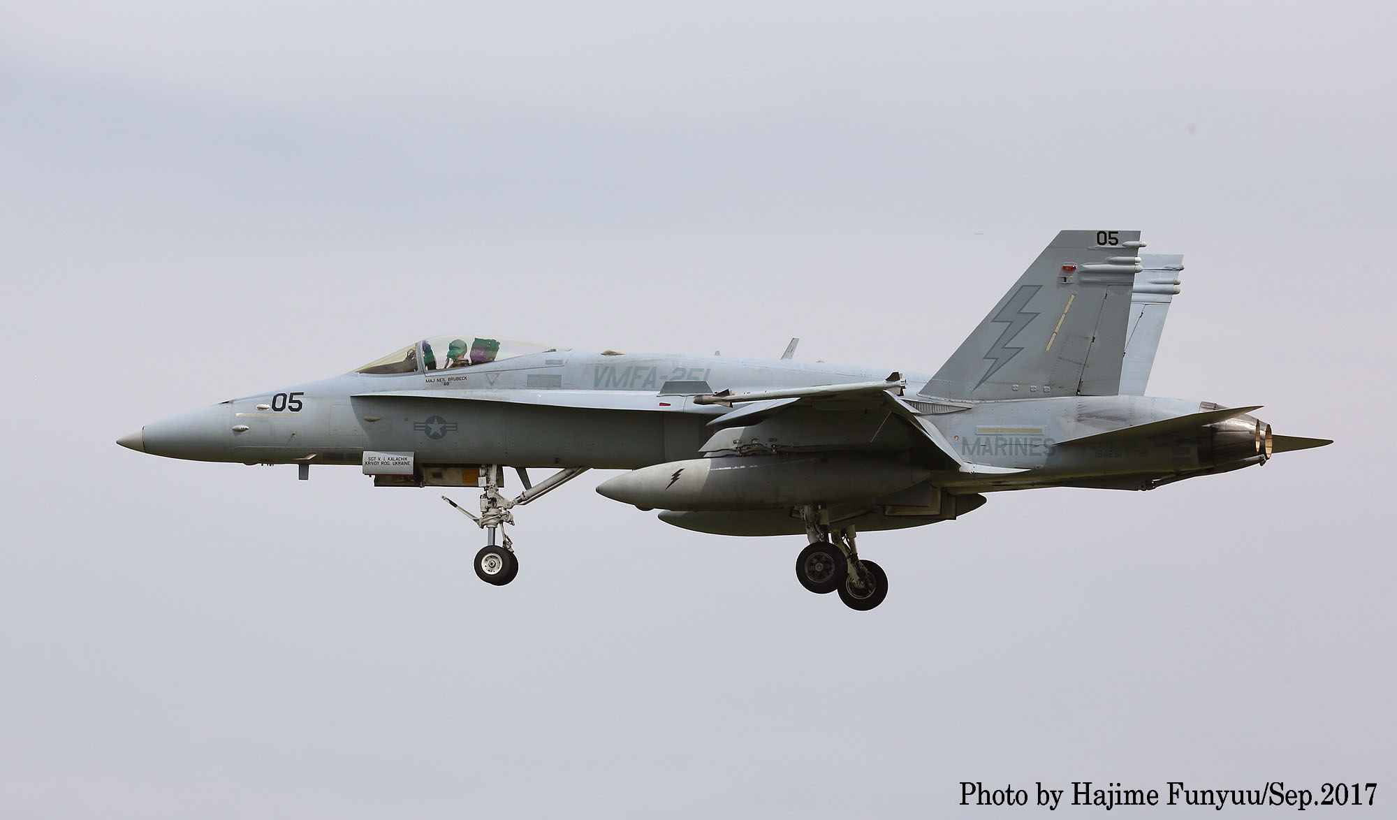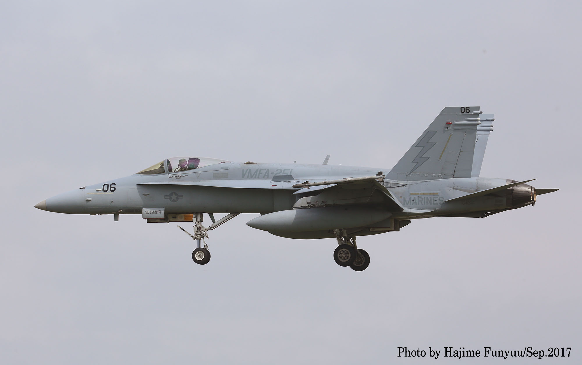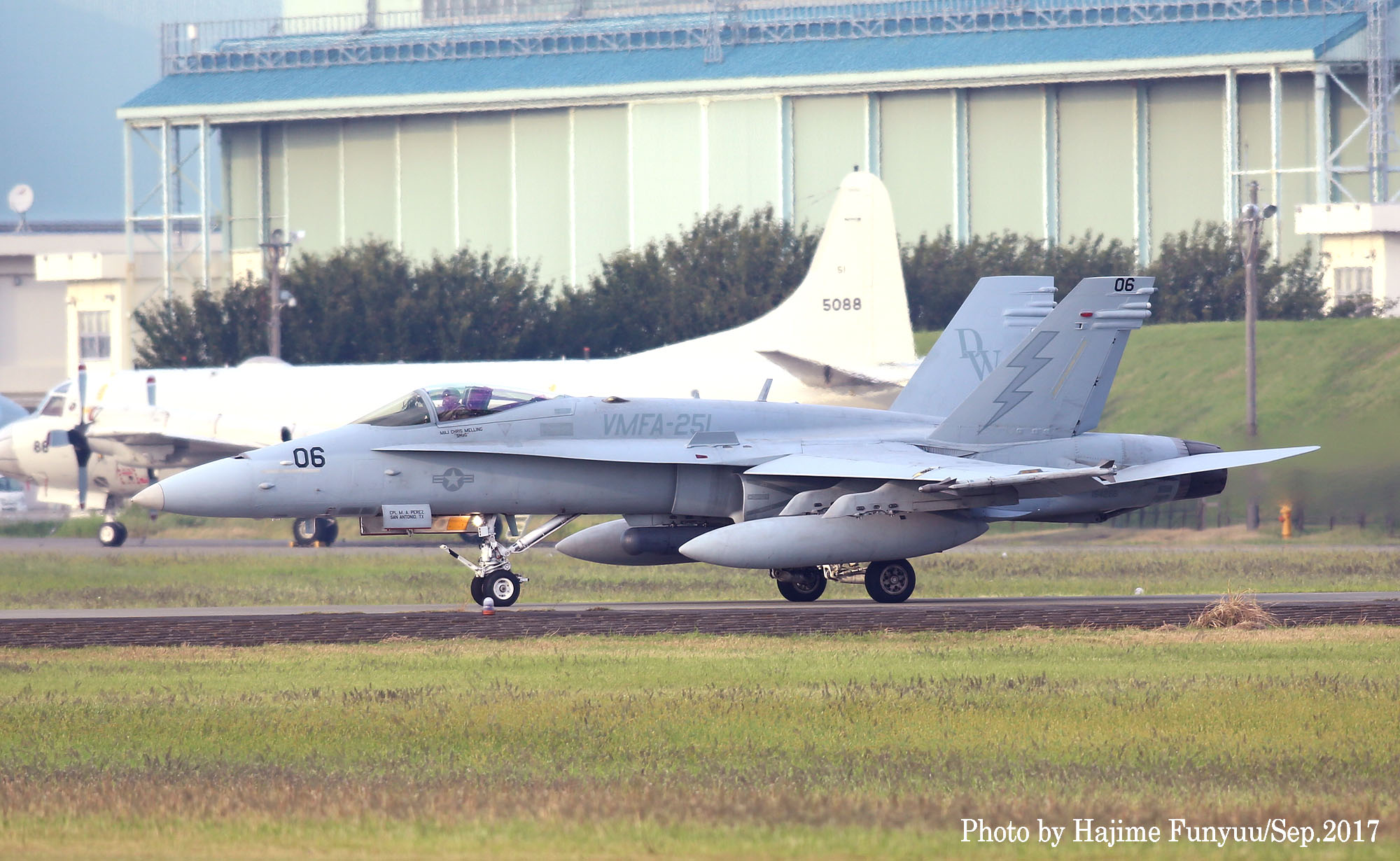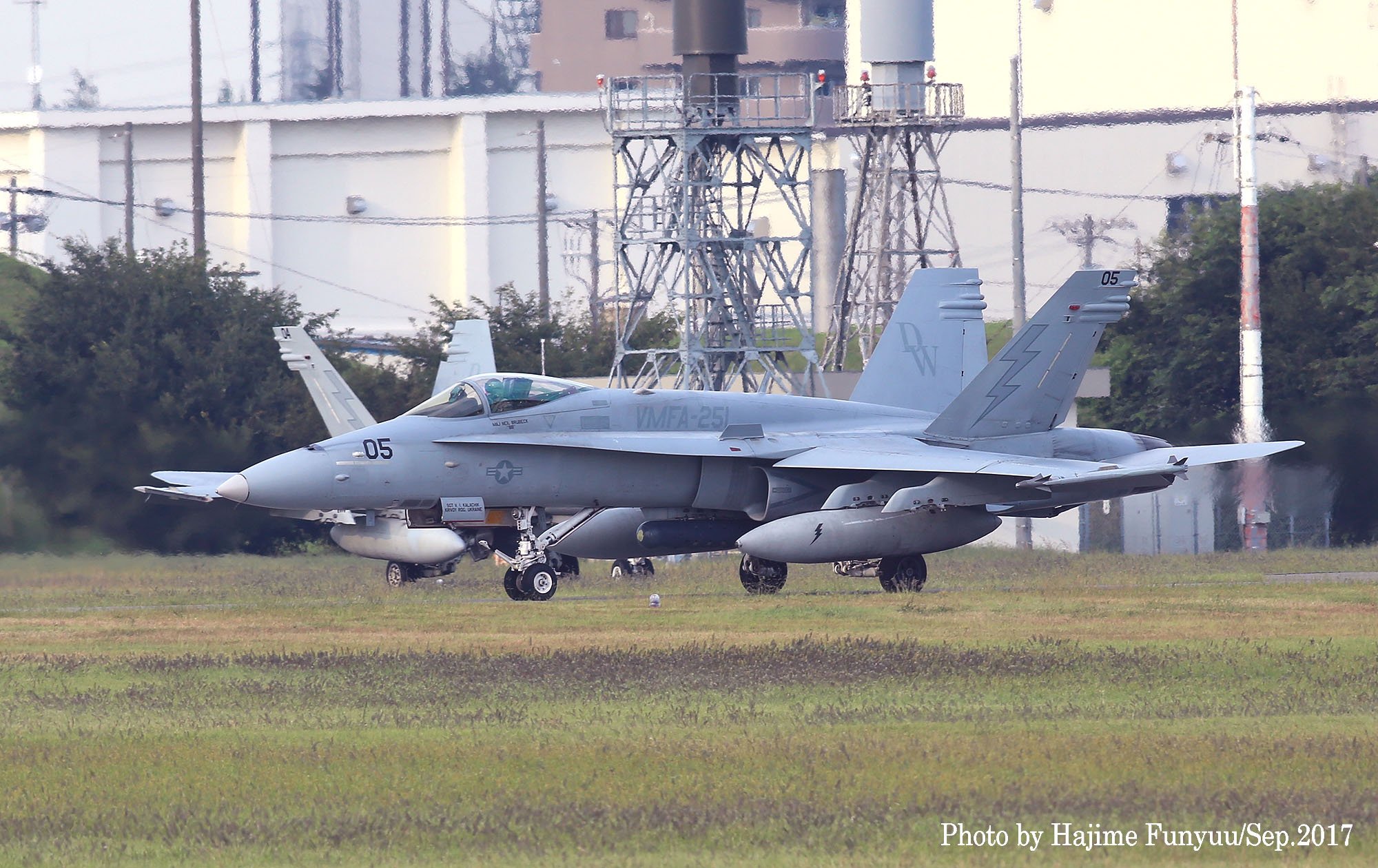 2017年9月13日VMFA-232に替わってVMFA-251"T-Bolts"が岩国にやってきた。FA-18C/D レガシーホーネット12機とアレンE・スコツェペック中佐率いる240人のスタッフの面々である。このコマンダーは、名前からポーランド系のアメリカ人らしいが、Topgunの出身で2003年頃には、VMFA-212に所属して岩国にも来ている。 彼自身は日本へのなじみは深いだろうがVMFA-251自体の日本展開は、いったい何年ぶりになるのであろうか・・・2004年以来だから13年ぶり・・・2004年の前も10年間来ていなかった飛行隊だけに マニアは大喜びである。厚木に展開したT-boltを友人のフニュ君が捉え送ってくれたので早速UPしたいと思う。(2017年11月 記)