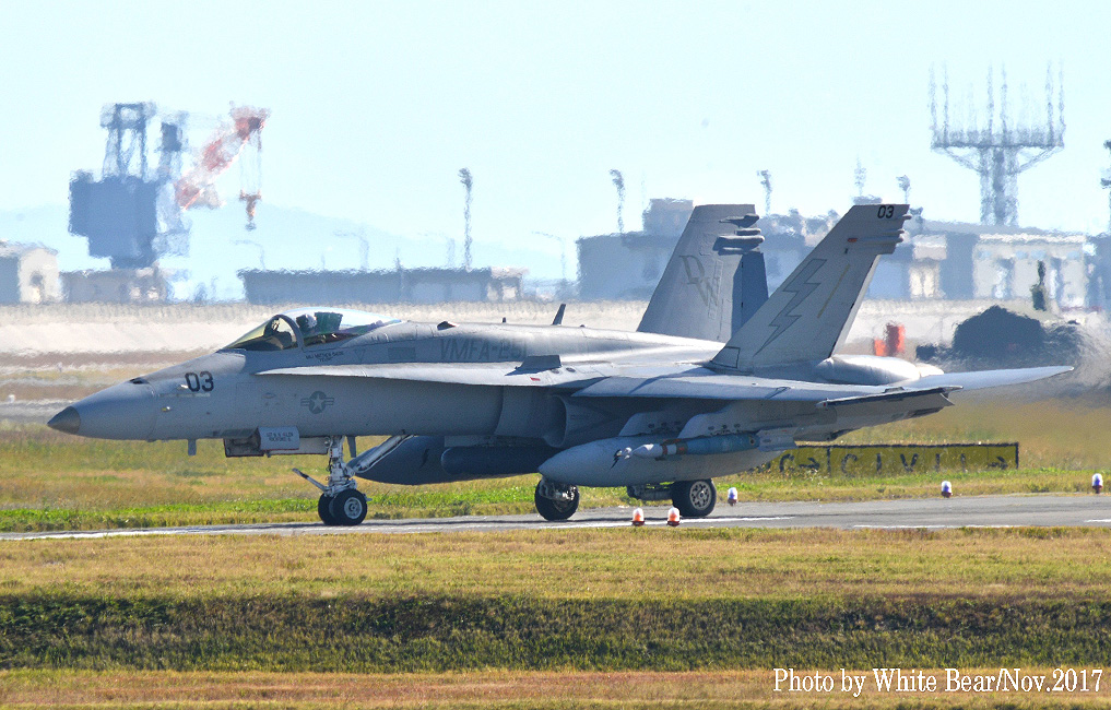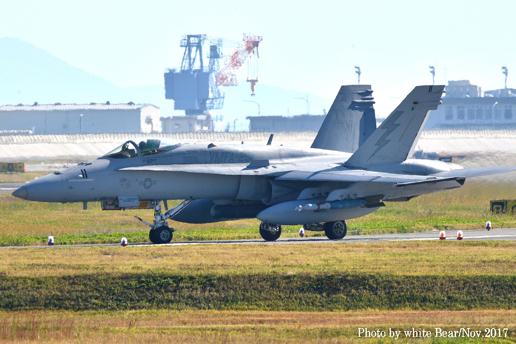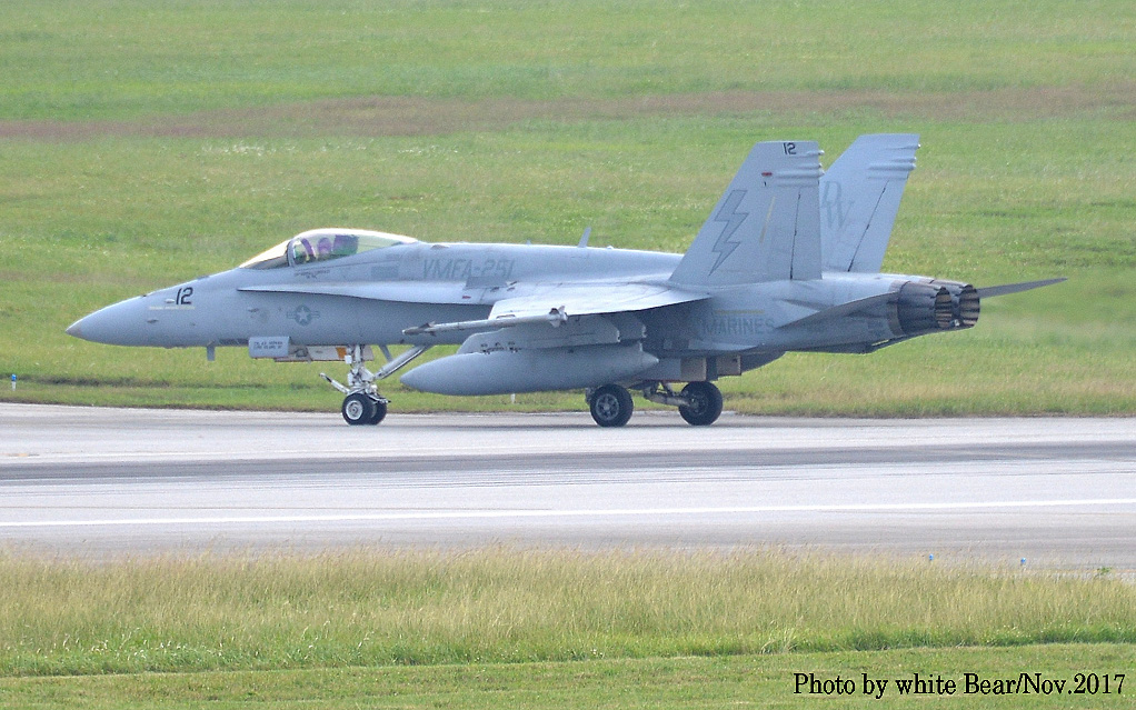 ↑ 2017年11月嘉手納基地に訓練から戻ってタキシーラインに入るVMFA-251のFA-18C/DW-12