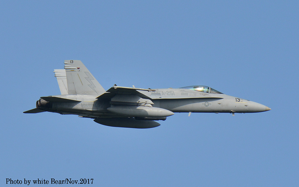 ↑ White Bear さんが恐らく嘉手納基地に行かれた時に撮影されたVMFA-251のFA-18C/DW-04。11月の岩国は光線状態が悪く、リベンジで嘉手納展開されたそうだ。