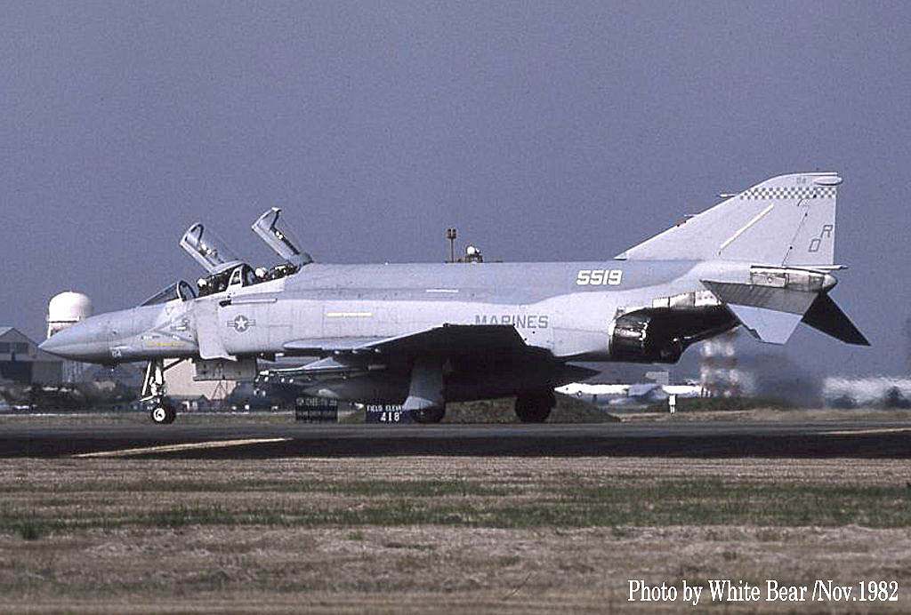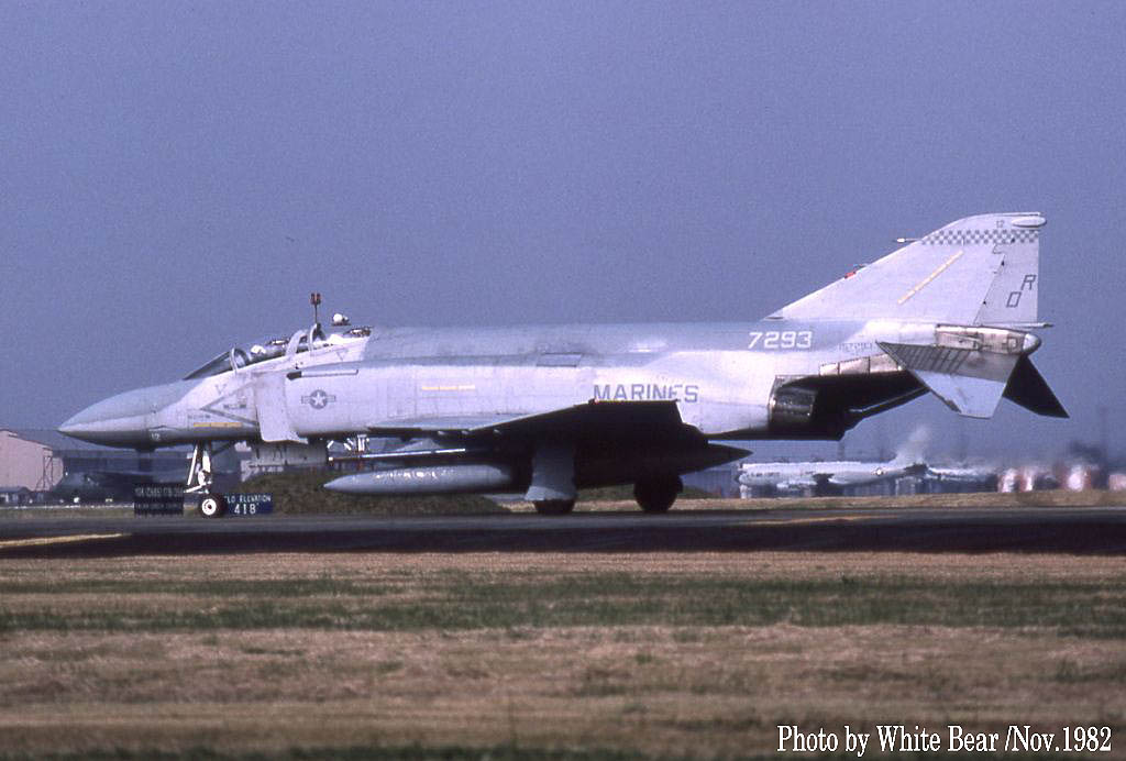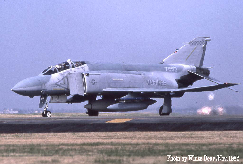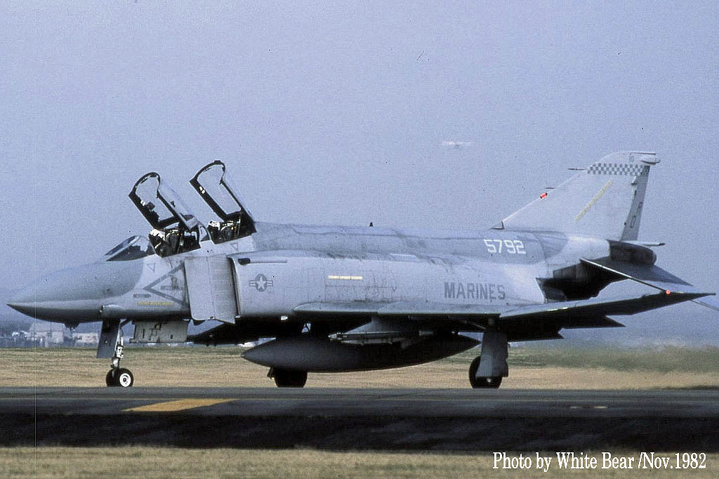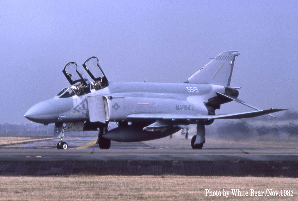 ↑ White Bearさんが、1982年11月横田基地で撮影された4機のF-4S。VMFA-312のF-4Sとしては2回目の岩国基地派遣の時であるが、完全な海兵隊仕様のロービジ塗装になってからは初めての来日であった。土曜日に横田基地に飛来して日曜日に岩国基地に戻ると言うクロカン動向を予測して横田基地へ遠征されたそうである。