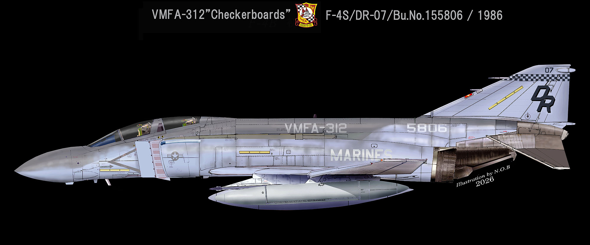 ↑ 1986年以降のVMFA-312のF-4Sのマーキング例で、尾翼のチェックラインとテールコードの色がダークグレーに変わり、読みやすくなっている。またテールコード”DR”は、黒色のシャドー付であった。MARINE/Bu.No.の4桁数字がライトグレーに変わっている。F-4S/DR-07/Bu.No.155806