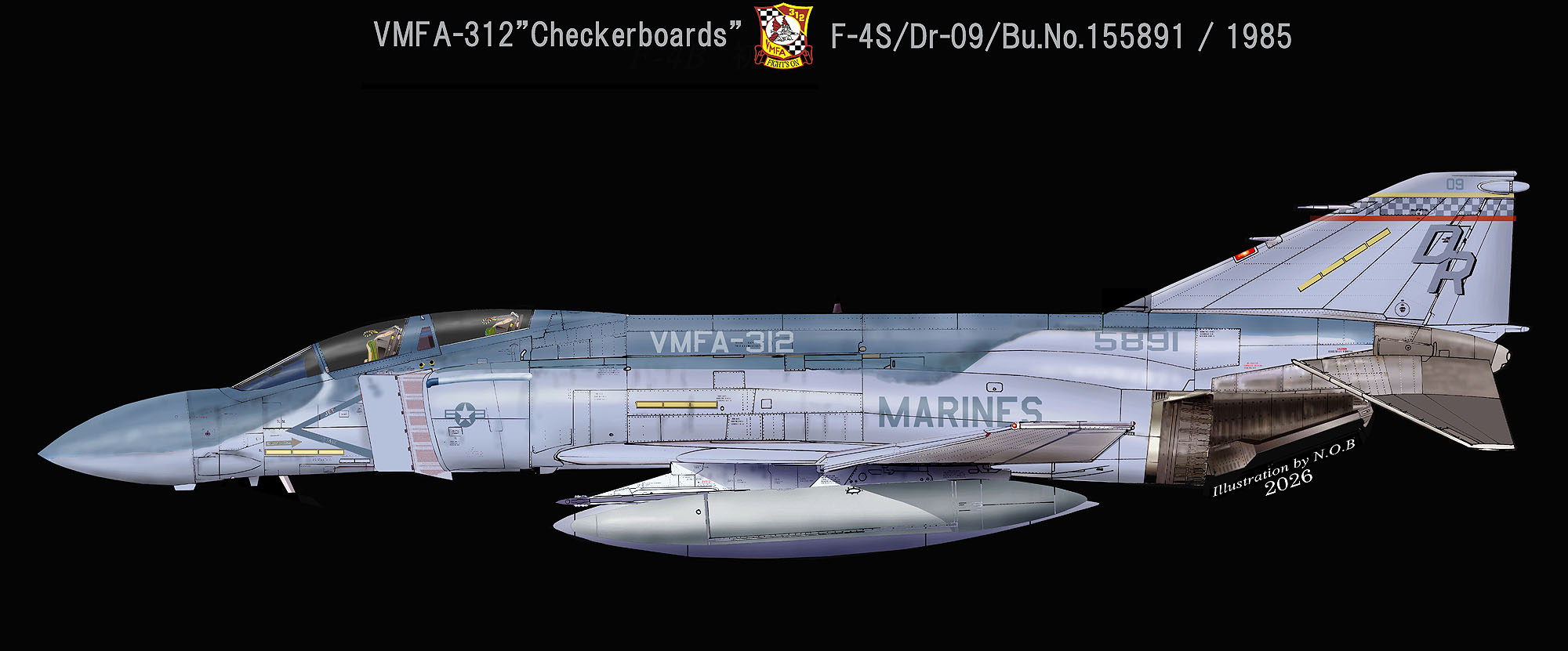 ↑ 1985年に岩国基地に派遣されたVMFA-312のF-4S/DR-09のマーキング。同隊の1985年版マーキングはトリムカラーが唯一復活した年であった。その他の場所は色の濃淡だけの違いで特に特徴は無い。F-4S/DR-09/Bu.No.155891