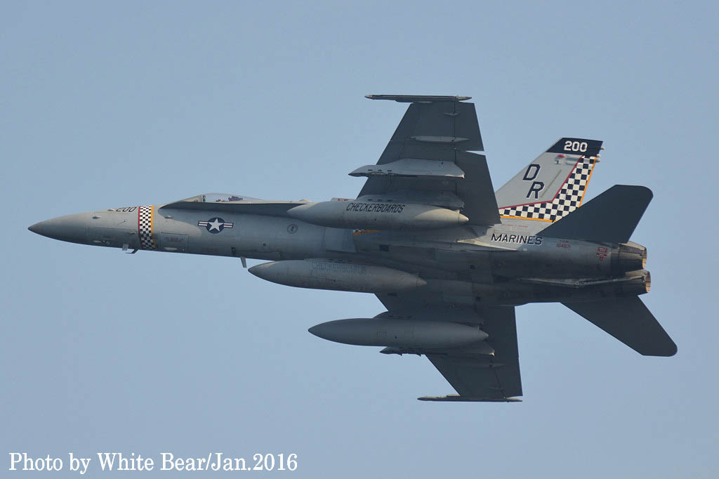 ↑2016年1月岩国基地でWhite Bearさんが撮影したVMFA-312の司令官指定機DR-200。同隊がFA-18に転換して4度目の岩国基地派遣の際、司令官指定機の塗装はF-4J時代のマーキングを彷彿させる魅力的なデザインを復活させていた。