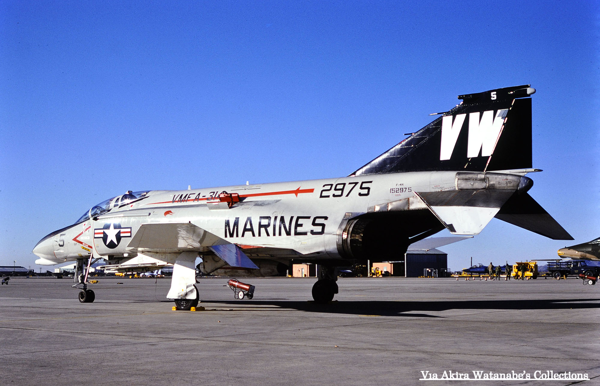 ↑ 同じく1975年12月に同地で撮影されたVMFA-314のF-4N/VW-2。海軍にはやはりナイツを部隊マークとして使用するVF-154ブラックナイツがあったが、ナイツのイメージは黑が強いのかもしれない。