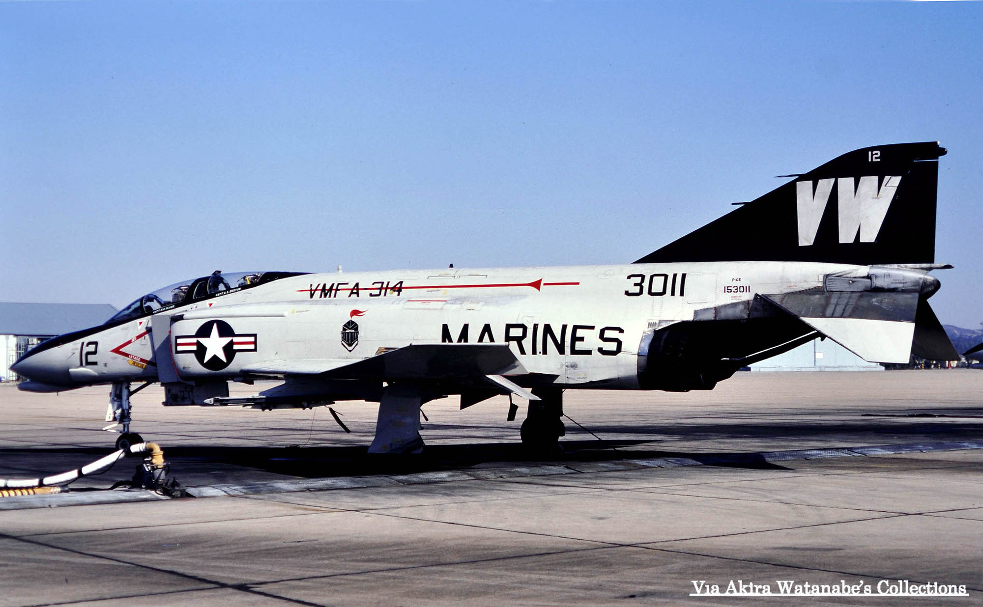 VMFA-314は1943年10月に創設された部隊で、MCASチェリー・ポイントでVMF-314としてF4-Uコルセアを受領、ミッドウェイ島に配備され、太平洋戦争末期の沖縄戦に参加している。太平洋戦争での戦果は14機の撃墜記録が残された。戦後は一時的に九州の航空基地に配備され、その後一度閉隊している。1952年フロリダでVMFA-314として再編されF-9Fパンサーに機種更新、1962年6月海兵隊で初めてF-4Bファントムを受領した部隊として有名である。翌年から早速ベトナム戦に駆り出され、ダ・ナン、チュ・ライを拠点に出撃を繰り返した。VMFA-314のF-4N時代は、尾翼を真っ黒に塗りこめ”VW"のレターを白で入れており、胴体にはナイトの矛を描いた実にシックな出で立ちであった。その後暫くは、MCASエルトロから日本に派遣されることは無く、雑誌で見掛けるだけの飛行隊であったが、1982年FA-18Aに転換してから岩国にも来る様になった。この飛行隊はFA-18Aに関しても、海兵隊で最初に機体を受領した部隊である。(2006年6月記)