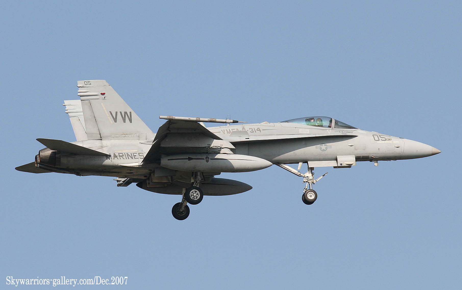 2007年12月に移動訓練で嘉手納基地に展開したF-18飛行隊の1つがVMFA-314であった。VMFA-312のページで、2007年末の嘉手納行の経緯は述べたので此処では省略するが、それまで私はこの飛行隊の撮影チャンスに殆ど恵まれなかった。F-4Nから最初に海兵隊のF-18飛行隊に転換した飛行隊であったが、何せマーキングが機種交換以来ずっと「地味の代表格」で、ちっとも撮影の意欲をそそらない。半ば馬鹿にした存在であったが為、向こうからも見放されていた。海軍機を中心にブラックテールが流行する中、この部隊こそ司令官機にブラックテールを持ってきて一番似合う飛行隊のはずである。 今回もまた伝統の味気ないマーキングで来日かと思っていたら、何と意表を突いてAVビデオのモザイクのような塗装でお出ましである。マニアの間では”ピクセル君”で既に馴染みの機体となったが、嘉手納ではフライトしたのは良いものの、普天間基地に道草を食いに行ったりして散々我々を待たせた上、やっと嘉手納に戻ってきたかと思ったら、ブラックテールのWE01のハリヤーとアプローチが重なり、おまけにR/W05 leftに降りおった。お陰でハリアーをR/W05 Rightで撮影してから、R/W05 Leftに猛ダッシュさせられ、何とかものに出来たもののマニア泣かせのスズメバチである。(2007/12/26記)