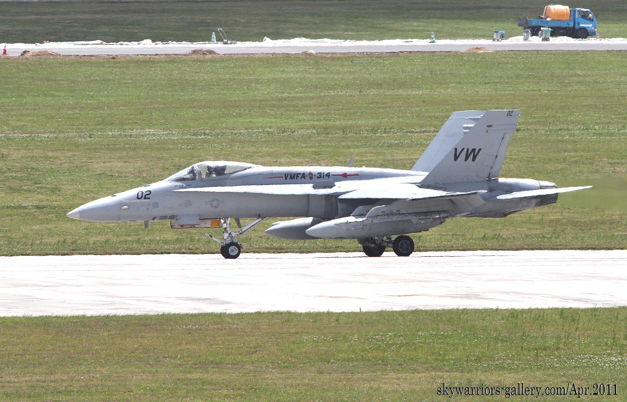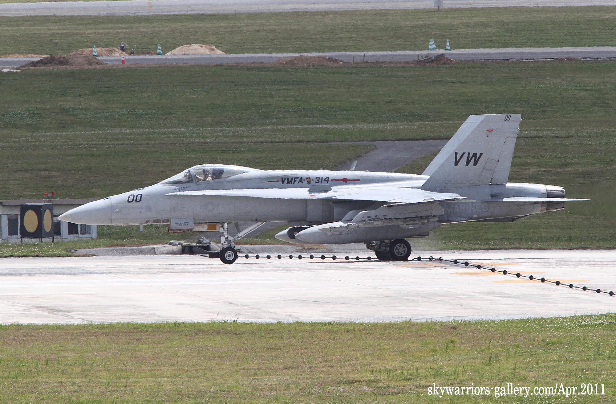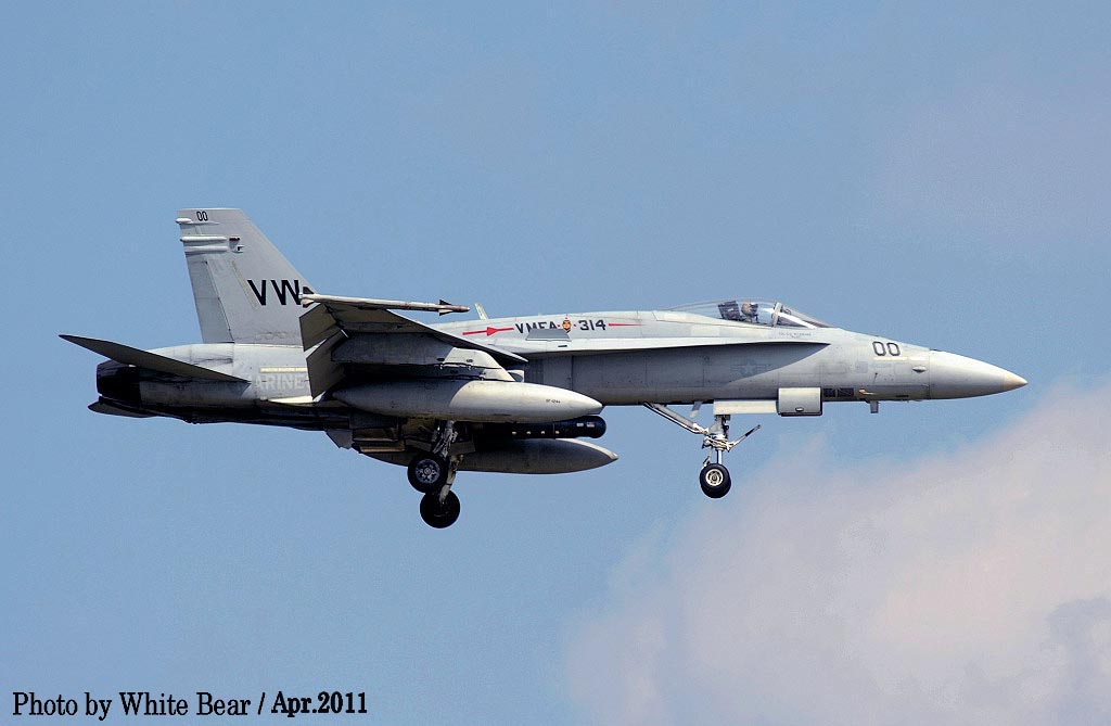 ↑ 2011年3月に岩国基地に配備されたVMFA-314。所属機全機の胴体上部左右に部隊マークであるナイトの兜が3色カラーで入るという久方に色気のあるマーキングだった。隊長指定機は尾翼には同じナイトの兜が大きく書かれ更に派手なものだった。F/A-18A+/Bu.No.162400。2014年にはほぼ同じマーキングが、FA-18A++/Bu.No.163416に引き継がれた。