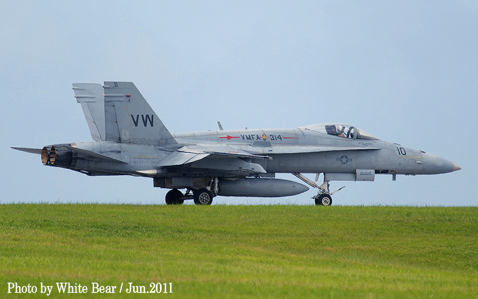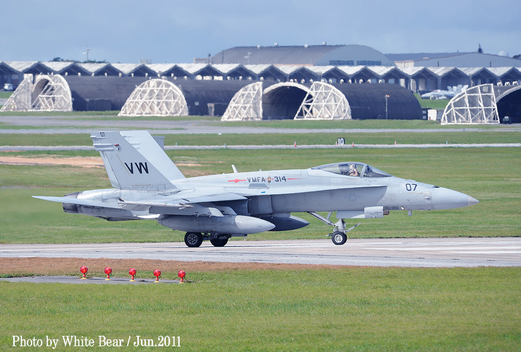 ↑ 時系列で並べるとWhite Bearさんは2011年6月に再び嘉手納基地を訪れVMFA-314を追っかけておられた。凄い!!写真は2011年6月嘉手納基地で訓練に励むVMFA-314のFa-18A++