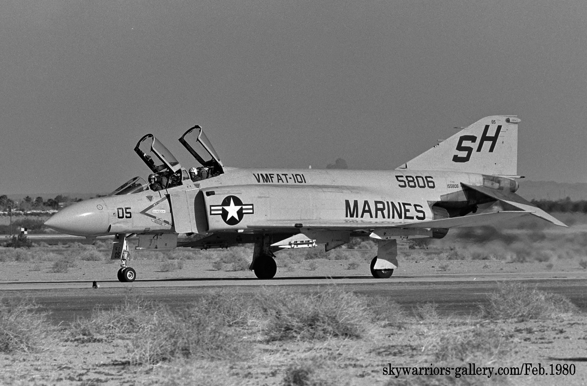 海兵隊のファントム部隊は当時殆ど東海岸のビューフォートにいたので、ユマでファントムが撮れるなどと考えてもいなかったが、この予備役部隊の合同訓練とVMFAT-101の訓練飛行で、毎日ファントムファントムファントムばかりが撮れる状態・・・A-4Mの部隊はこの訓練期間中何処かに移動しているようで姿も無かった。但しA-4Mの訓練部隊VMAT-102は居てくれたので撮る事ができたのである。前項でご覧いただいたようにVMFAT-101も数年前までは実に美しいマーキングであったのだが、海軍/海兵隊に迫りつつあったロービジの波を最初に受けた部隊のようで、機体に黒以外の色彩は見られなかったのが残念。