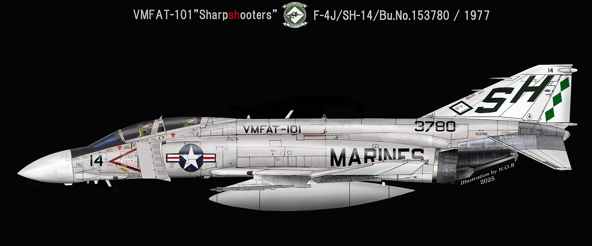 ↑ 1977年前後にマーキングが全面的に変更となり、上図の様な白い尾翼にダイヤモンドをラダーに入れたタイプとなった。しかし暫くして尾翼の白い機体は無くなり、グレーの地にダイヤモンドが書かれた塗装となっている。F-4J/SH-14/Bu.No.153780