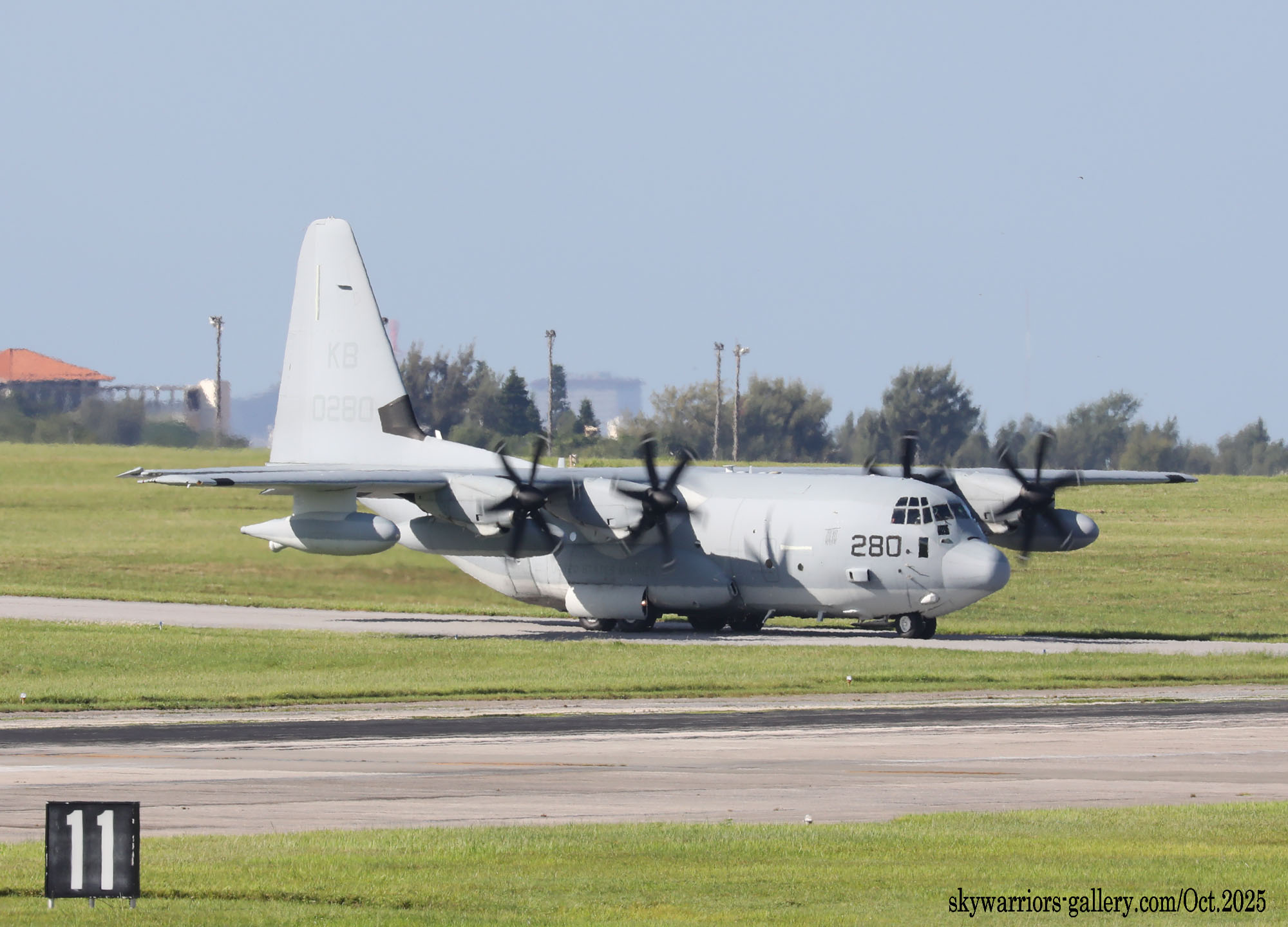 ↑ 2025年10月某日 嘉手納基地を離陸する為ランウェイに進入したVMGR-153のKC-130J/Bu.No.170280。KB-280番は私にとっては初めてファインダーに収める機体であった。