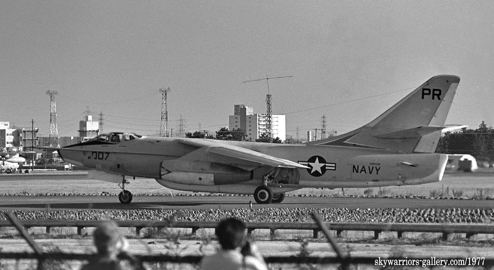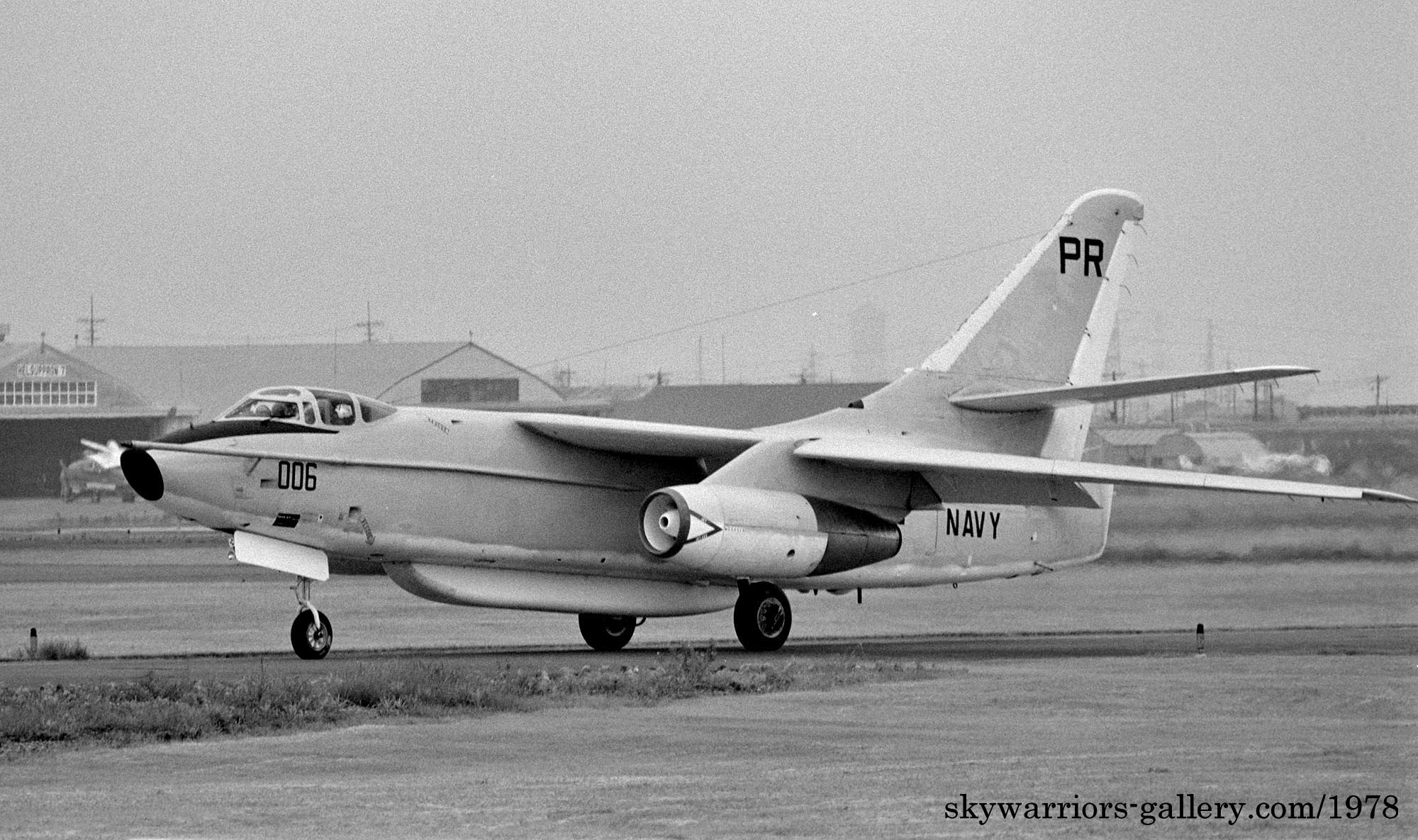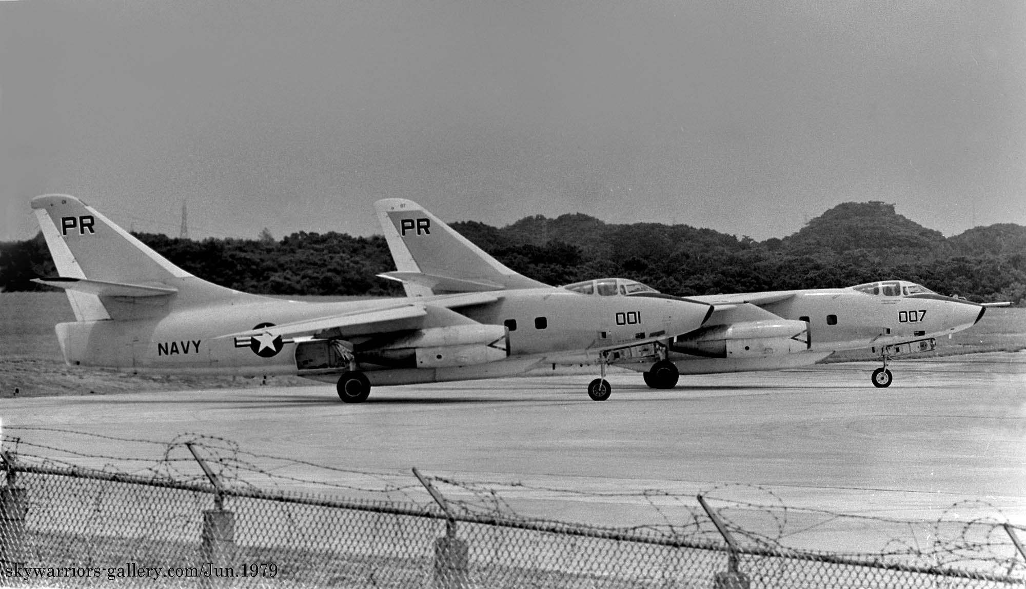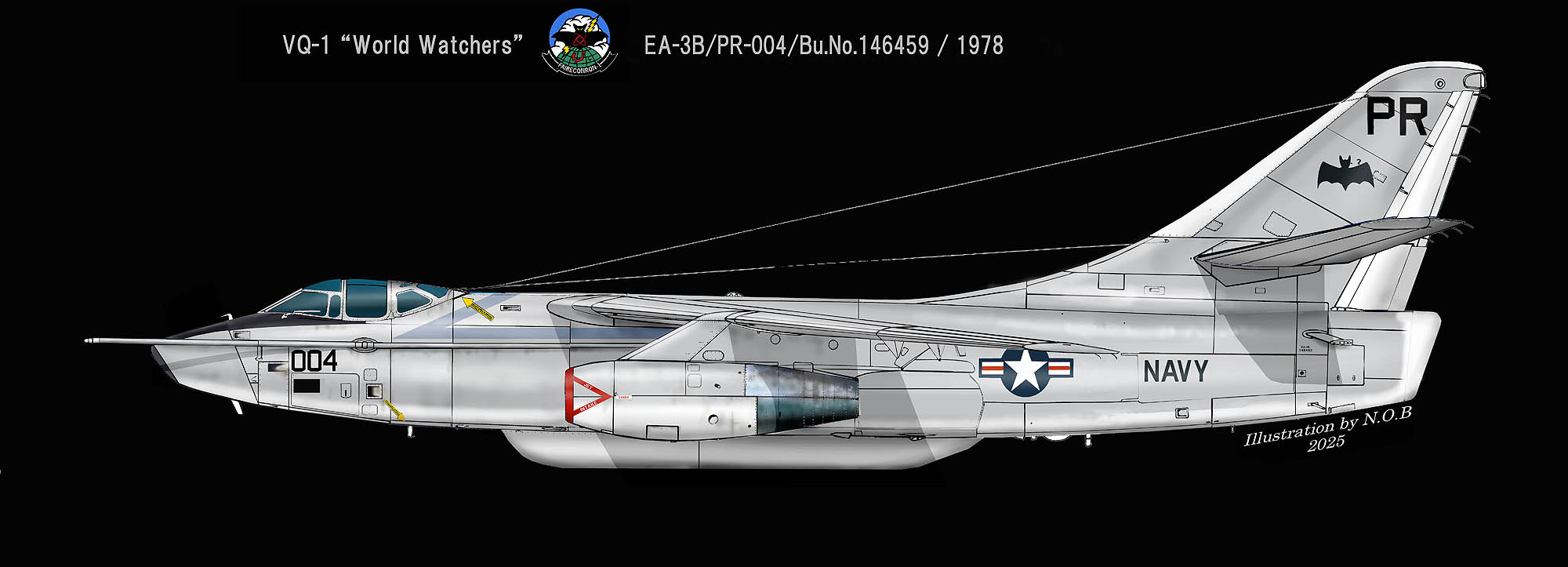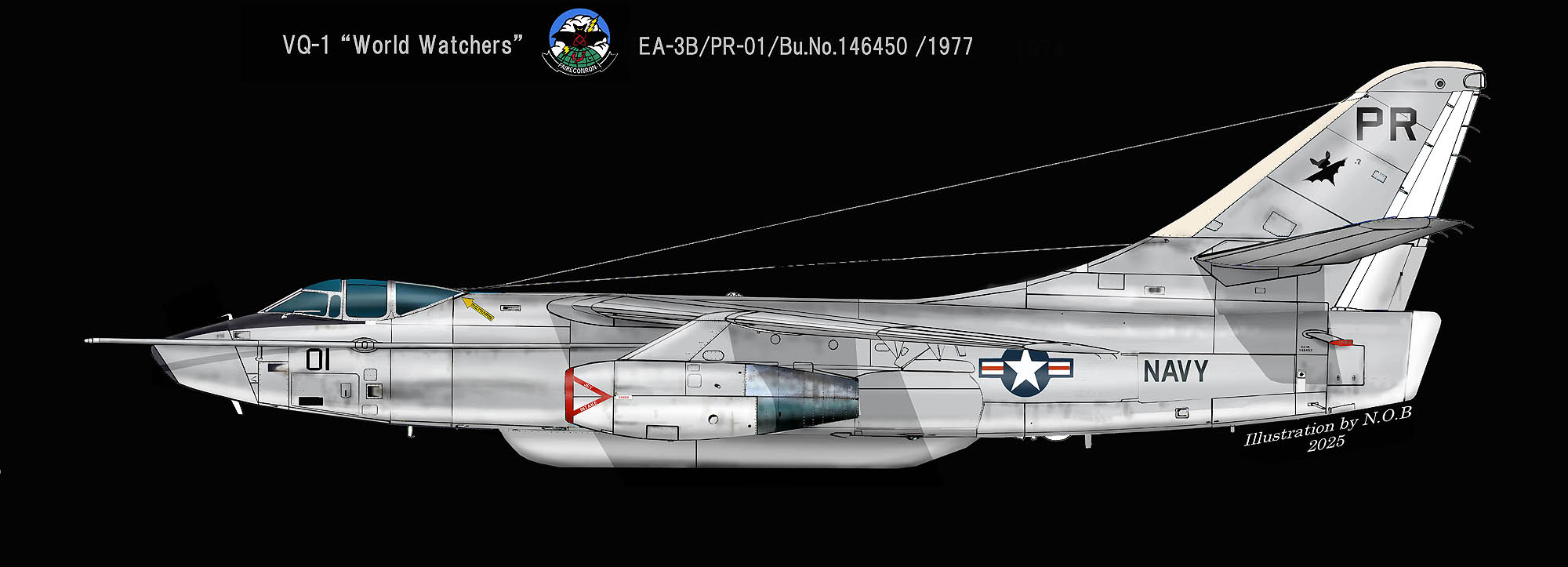 ↑ 私にとっては、VQ-1/PR-001を見る最後となった1979年10月、このEA-3B/Bu.No.146450は、1982年8月4日インド洋上でUSSレンジャーから発艦後、墜落して失われており、その後 VQ-1は”001”を欠番にしたと言われる。