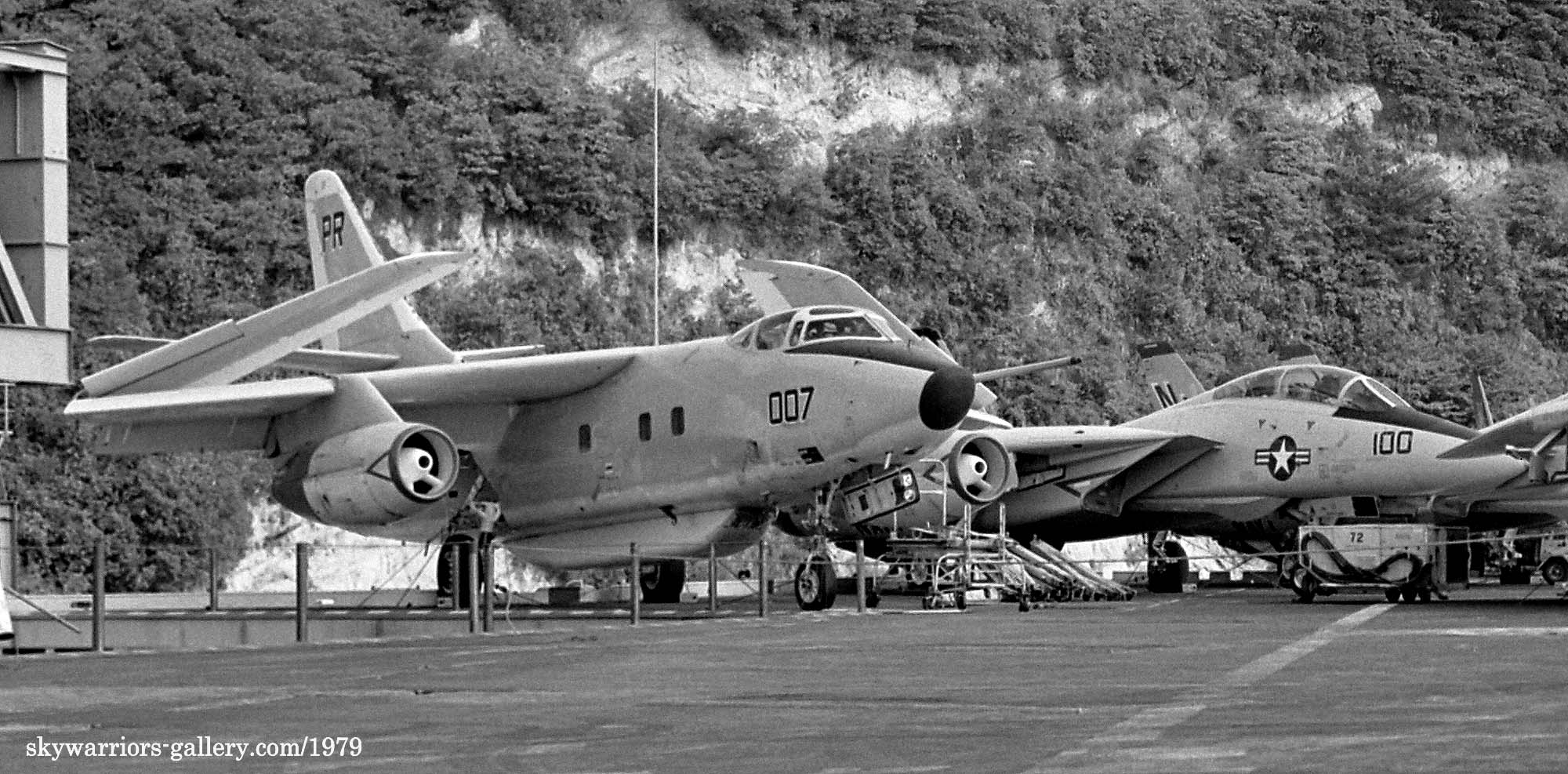 ↑ 1979年10月のUSSキティホーク横須賀寄港に伴い、艦内および甲板が解放されて、当時最新鋭のF-14Aも間近で見る事ができた。トムキャットに目が行き過ぎてあまり注目されなかったが、艦上にはVQ-1のEA-3B/PR-001/007がいたのである。彼らはCVW-15(NL)の面々の中で運用されていたが、CVW-15にはEA-6Bを持つVAQ-135が搭載されていたので、どのようなすみ分けで、電子戦運用されていたのかは不明。