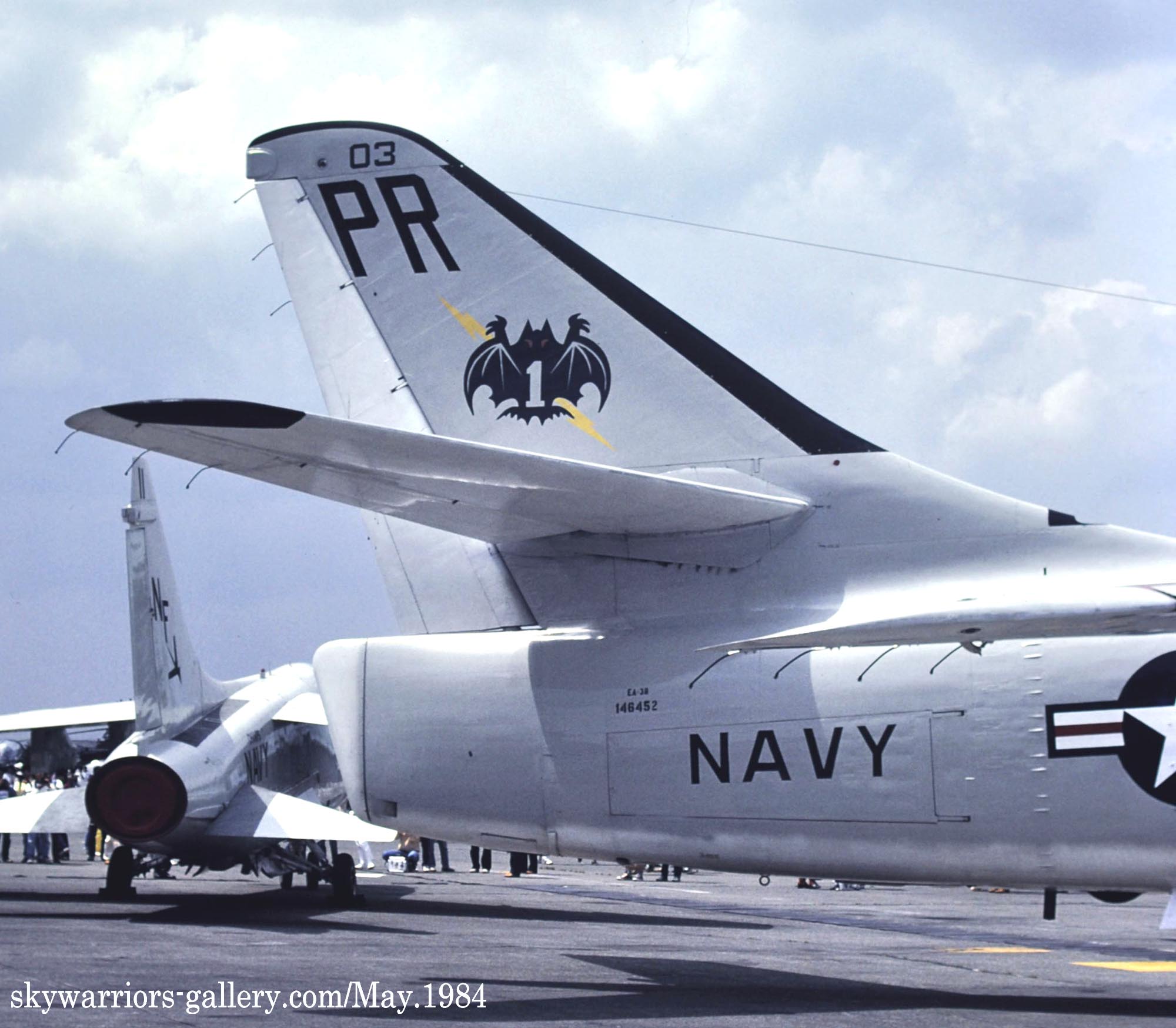 ↑ 1984年の厚木基地航空祭に展示されたVQ-1のEA-3B/PR-03/Bu.No.146452。展示機でもなければ、胴体後部のビューアルナンバーを中々はっきりと撮影できないので、わざわざ此処を狙って撮った記憶がある。この1984年前後から、統一された蝙蝠のデザインでEP-3E等もマークを入れるようになって、厚木の海軍マニアが嬉しかった時期である。