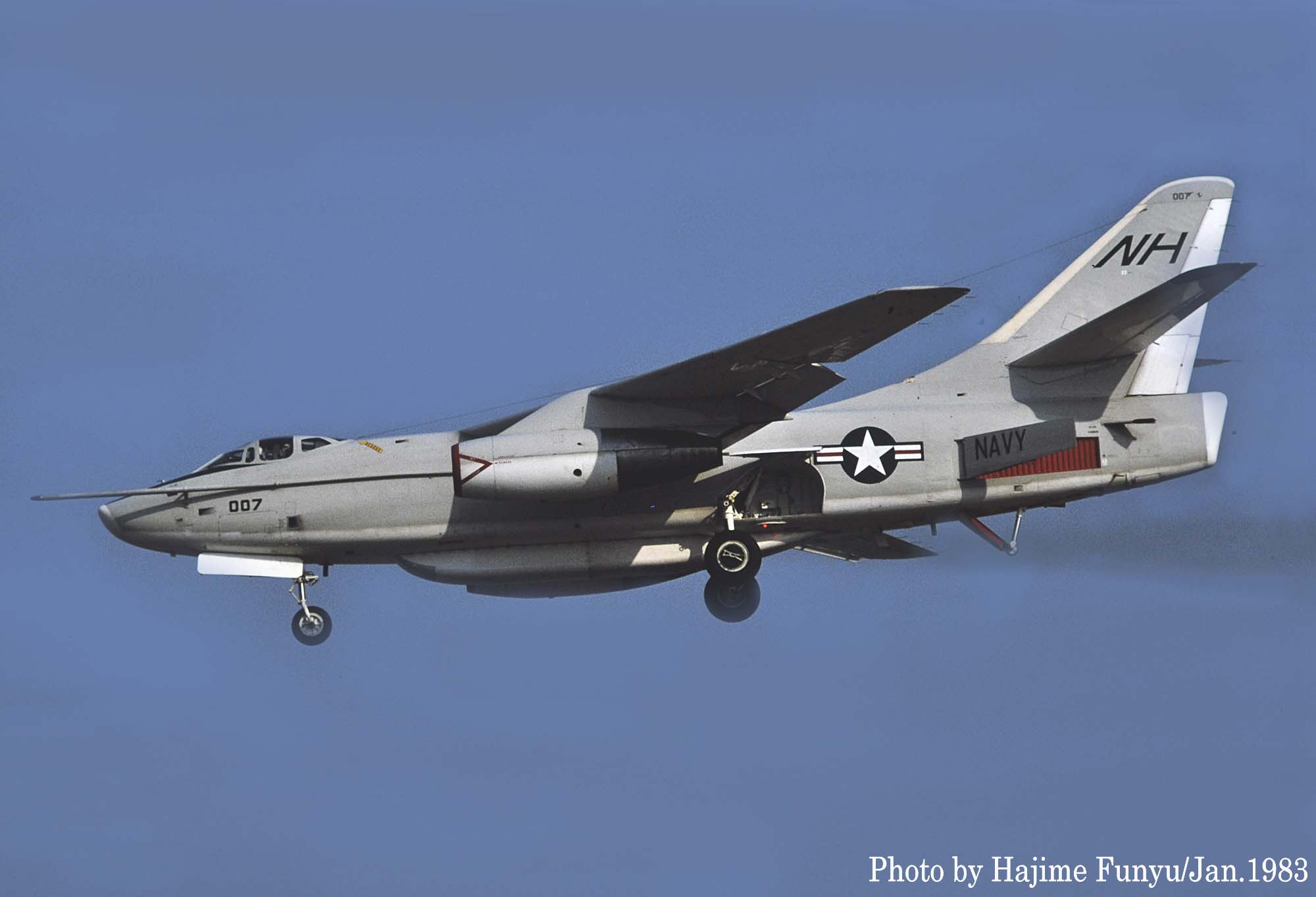 ↑ フニュ師匠が1983年1月厚木基地で撮影した貴重な”NH"のテールコードを入れたVQ-1のEA-3B。ビューアルナンバーは不明だが、恐らくBu.No.144849であろう。尾翼のチップの”007”の7はルガー拳銃の形をしており、映画007のロゴを真似ている。