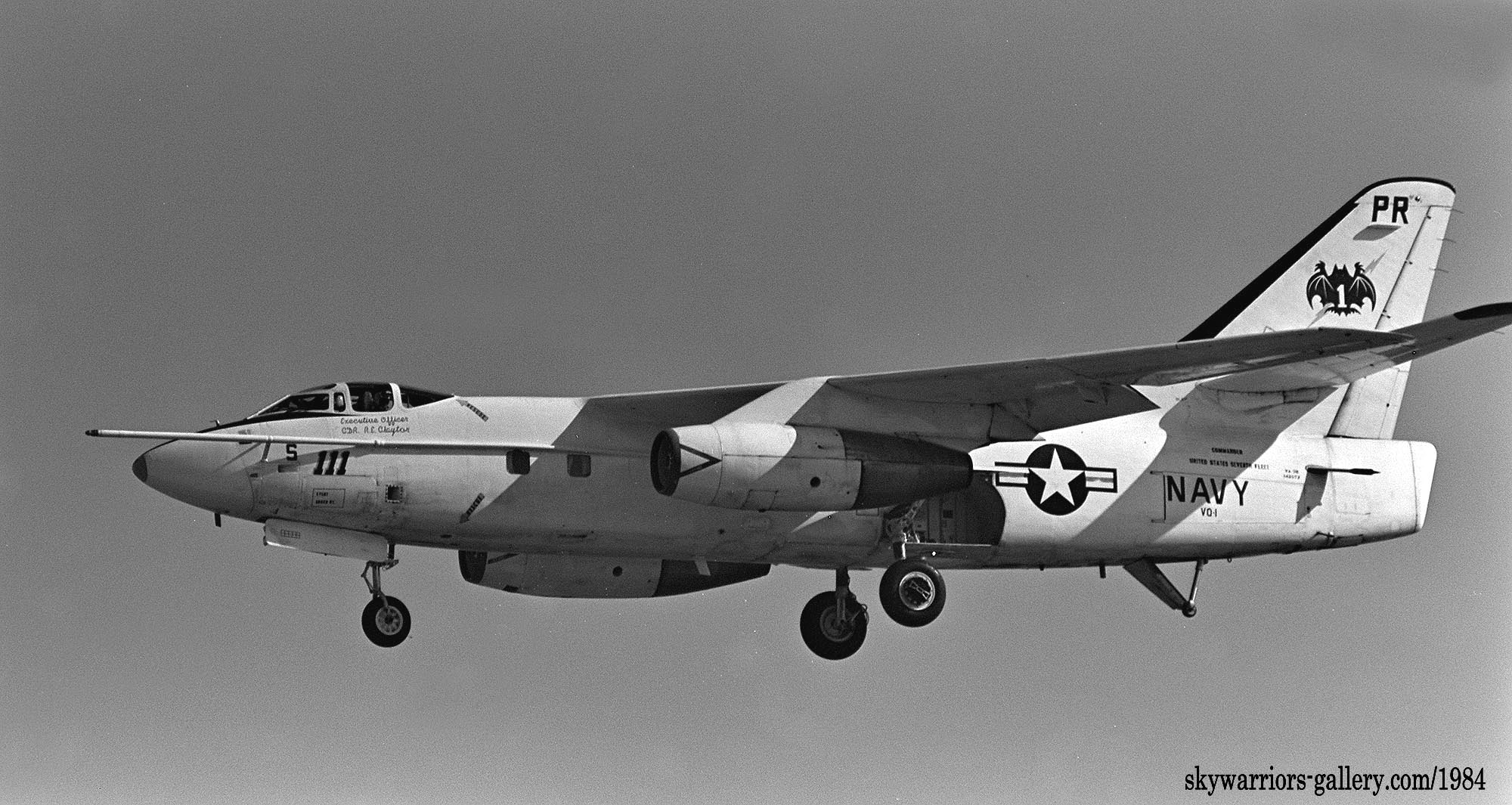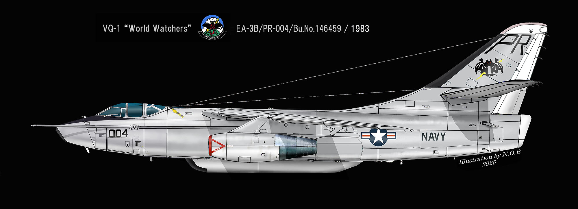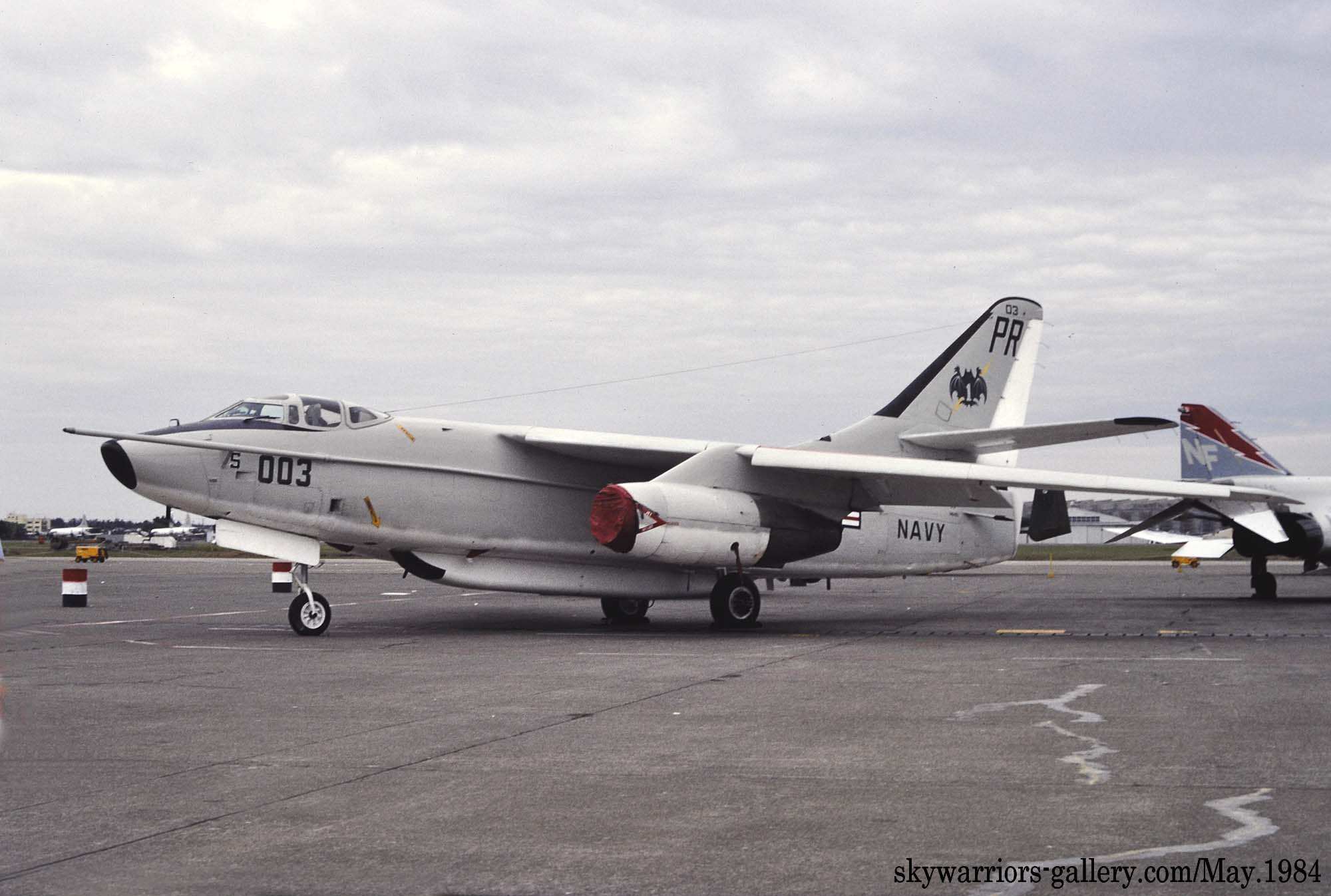 ↑ VQ-1の機体でシンボルの蝙蝠が横方向に書かれた珍しいデザインで、しかも1981年頃は殆どノーマークの機体が多かった中、注目されたEA-3Bであった。このPR-006のEA-3Bは、Bu.No.142671で、8月にも飛来している。