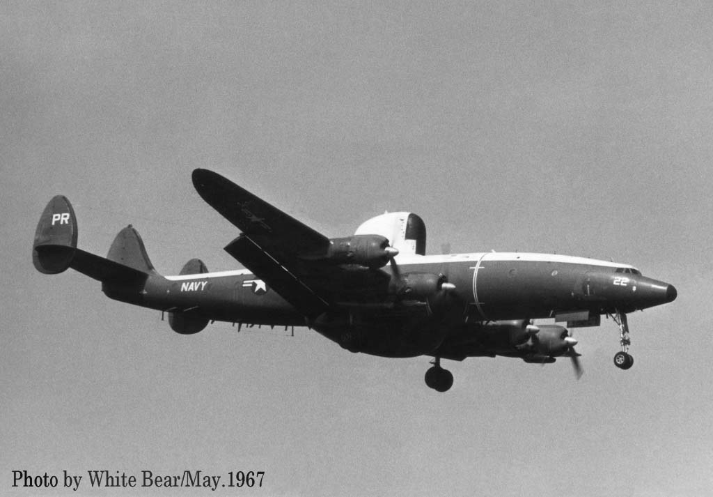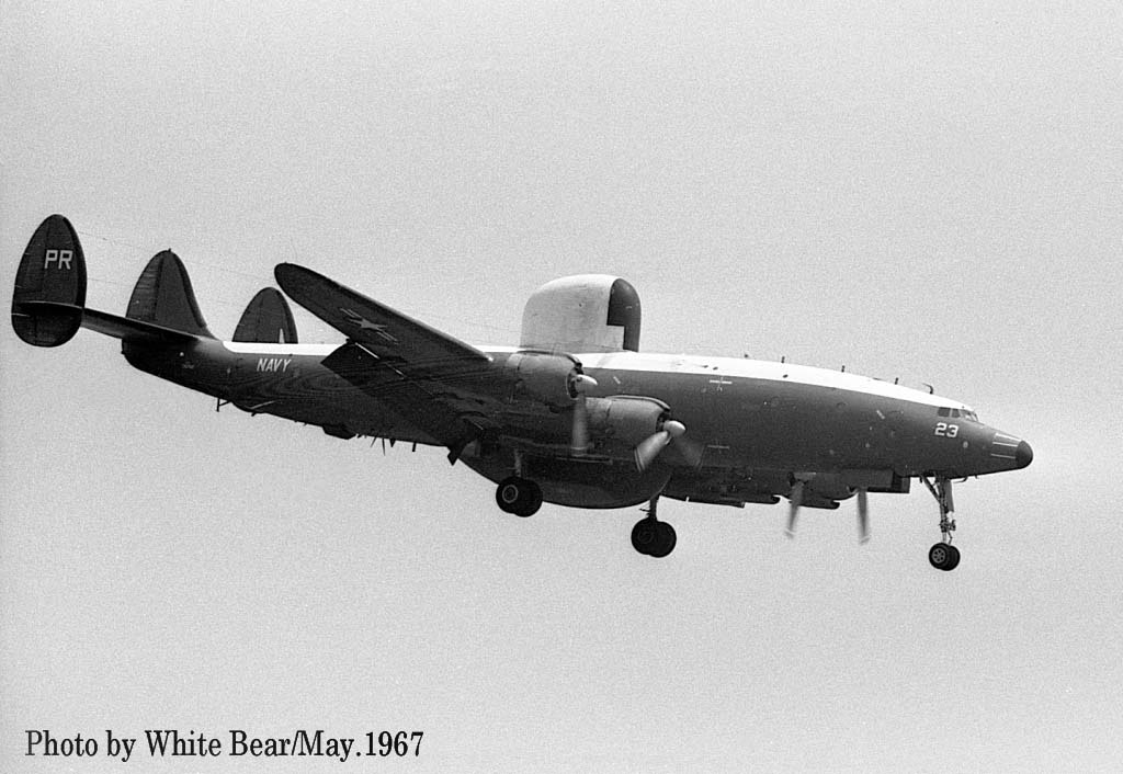 ↑ 1967年3月 厚木基地で撮影されたEC-121M/PR-26/Bu.No.145927。White Bearさんによれば、この時が初飛来だそうで、主翼のチップタンクを付けていた。1970年3月16日台湾の台南市からベトナムのダナンに帰投時。ダナンのランウェイに進入機を発見し、これをかわそうとして失敗、格納庫やF-4D等と激突して失われた。