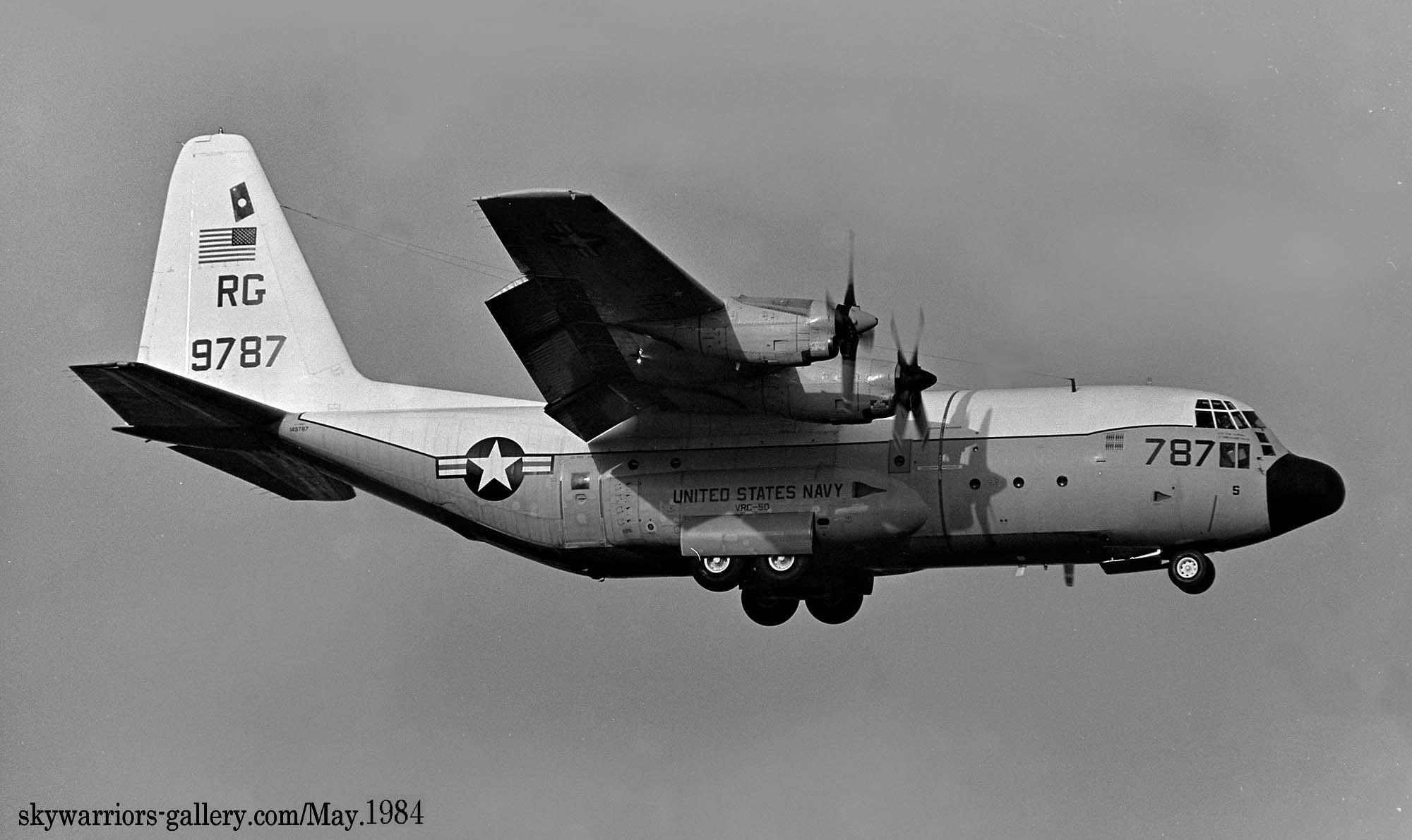 ↑ 1984年厚木基地R/W-19に着陸するVRC-50のC-130F/Bu.No.149787。1960年代中期にはVR-21に所属して”RZ"のテールコードを付けていた。日本でよく見る事ができたC-130Fの1機である。