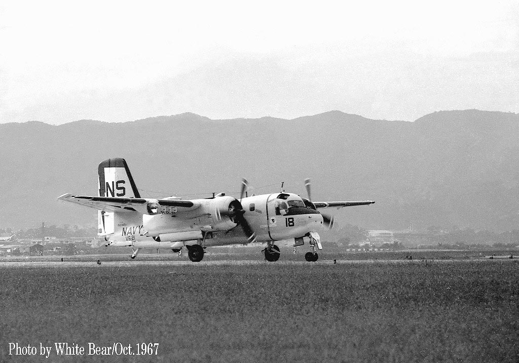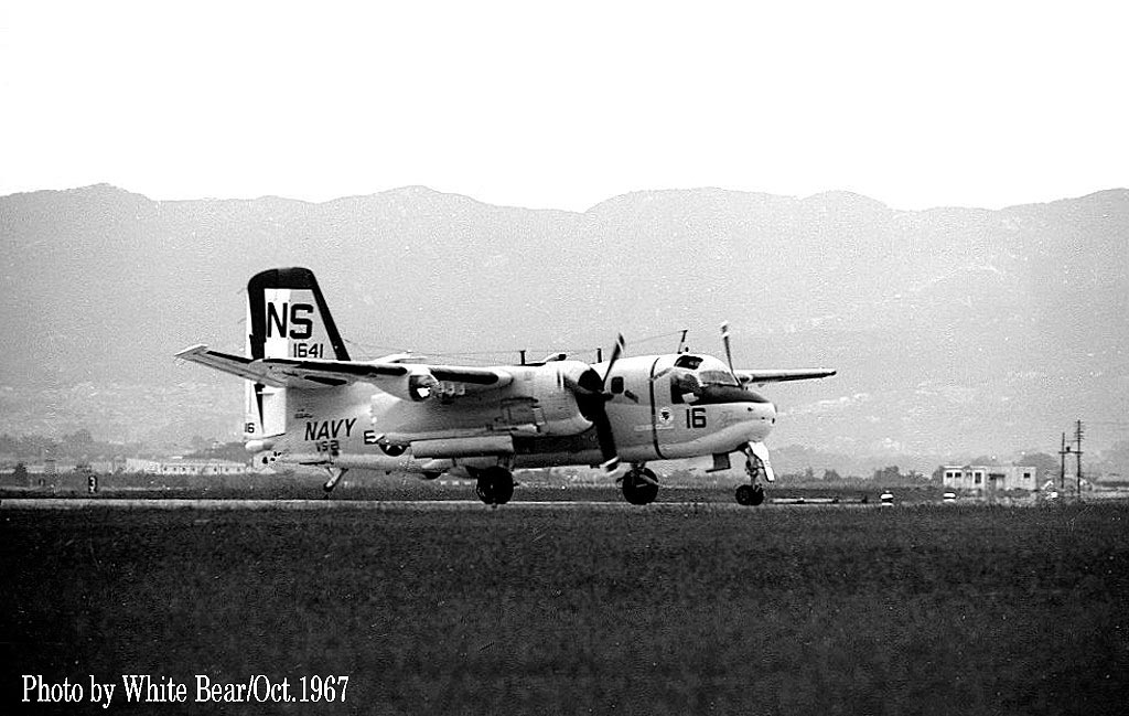 ↑ 1967年10月 White Bearさんが伊丹飛行場で撮影されたVs-21のS-2E/NS-16。White Bearさん曰く、当時は情報が全くなく、運だけが頼りだったが、この日運よく夕方近くになって突然2機のS-2Eが飛来したとの事。何故 2機での飛来かと言えば、1機が整備目的で飛来する場合、もう1機が整備対象の機体の乗員を回収して母艦に帰る為である。着陸後、1機は整備に入り、他の1機は乗員を乗せて対潜空母などに戻って行った。