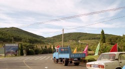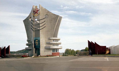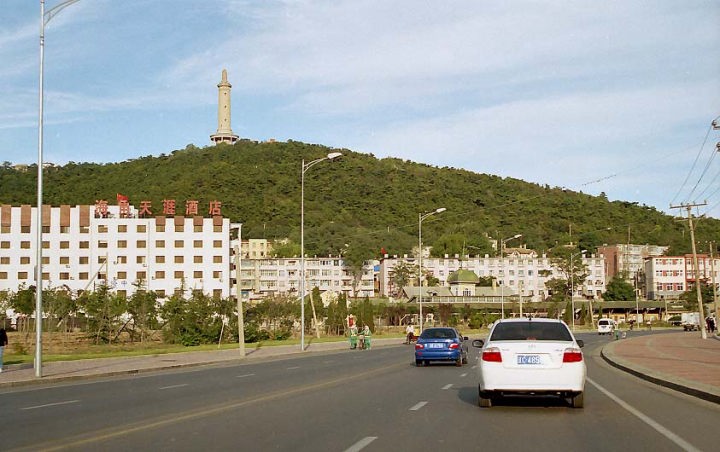 左は旅順の町を走る幹線道路、道路の右手は軍港が連なる。山の上に聳えるのは”白玉山南峯”と言って、元々は”表忠塔”と名づけられた記念塔。ここへは行かなかったのだがこの場所からだと軍港が一望でき停泊中の艦船がすべて撮影できそうである。多分外人の立ち入りは一切出来ないのだろうが・・・この塔、何と乃木大将と東郷平八郎元帥の提案で1907年に建立されたものであるそうだ。旅順の町には今でも多くのロシア時代・日本統治時代の建物が残っており 観光の名所になっている。道は大連方面に向かっている。