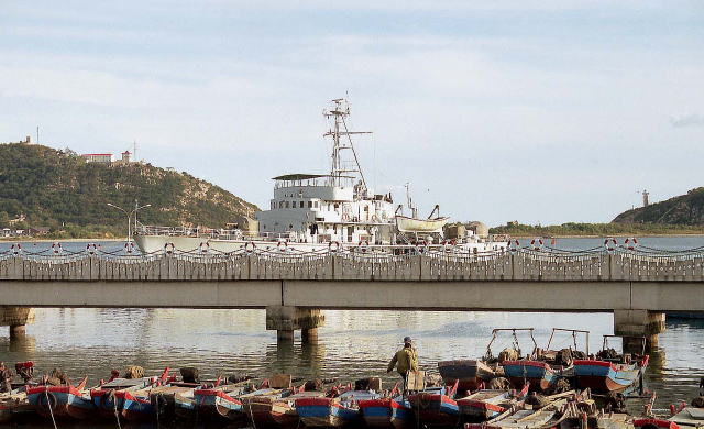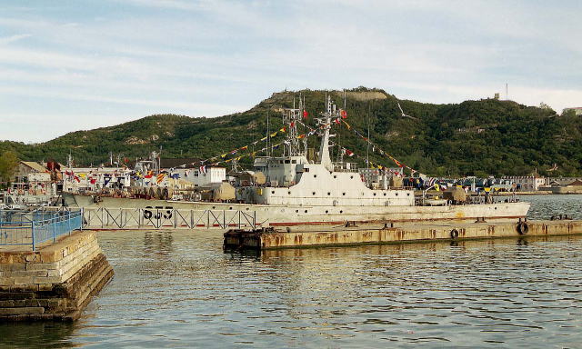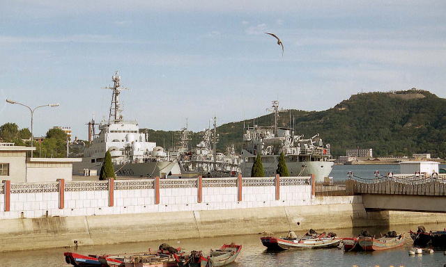 よく判らないが、海洋観測艦と補給艦が係留されており、その向こうに中型のフリゲート4隻が停泊していた。軍港の中心部であり外国人の立ち入りは禁止されている。ビクビクしながら撮った写真。