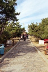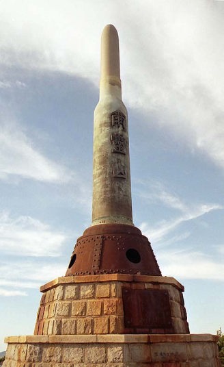 左から・・・203高地に向かう道。此処からだと何処が203高地か判らないが、左手の小高い丘がそれである。観光用の駐車スペースまで行き少し登ると石畳の坂がある(写真中)、ここを登りきると頂上に砲弾の形をした記念碑が建っている(写真右)。これは此処の戦いで亡くなった多くの日本陸軍軍人の魂を慰める為、乃木大将が1905年に建立したもので文化大革命でも破壊されずに残されていた。戦場に残された弾薬の薬莢を鋳造して造ったものだそうだ。今では観光の目玉でもある。”爾霊山”とあるが”203”と掛けているらしい。
