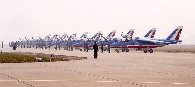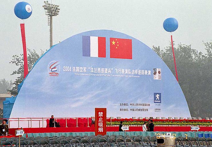 フランス空軍のアクロバットチーム「パトルイユ・ド・フランス」は、10月開幕した「フランス文化年」の目玉イベントの一つとしてアジア巡回公演を行ったもの。1931に結成され50年以上の歴史を誇るフランスの「空中儀兵隊」である「パトルイユ・ド・フランス」は、今回初めてシラク大統領と共に某国に訪れた。チームは北京の後、武漢、珠海、香港を巡回した。