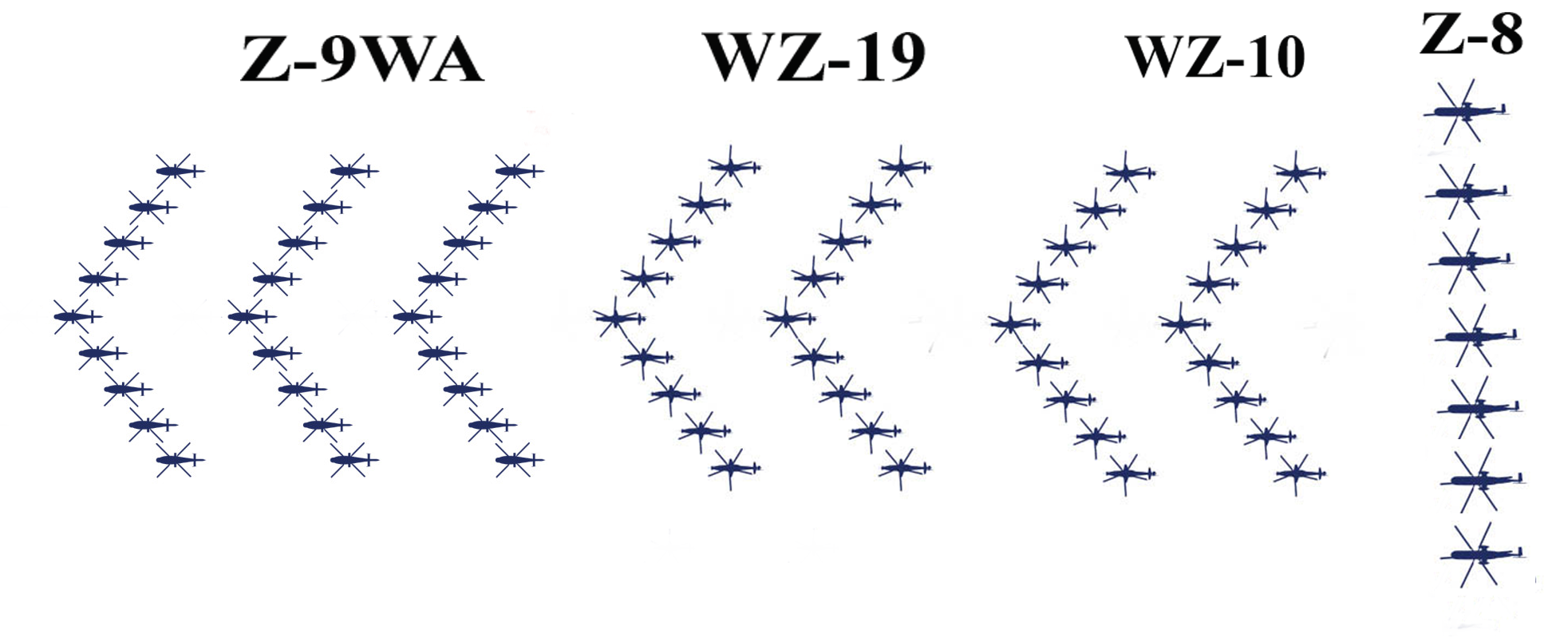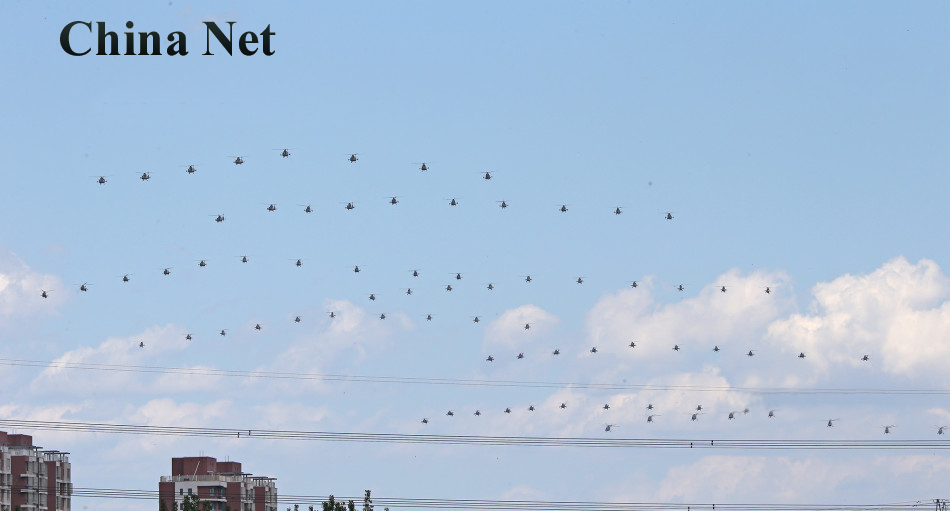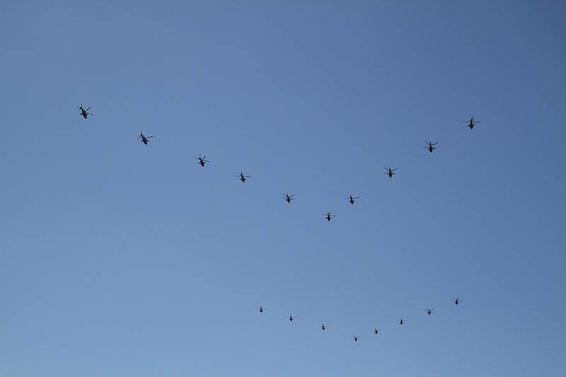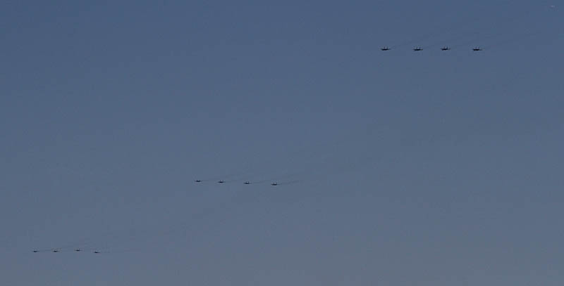 訓練が始まれば土日でも飛ぶことがあるので近場のベースは様子を見に行ったが、それらしい気配はない。そうこうしているうちに 突然ネットにUPされた下の写真を見てタマゲタ・・・ヘリの編隊 約80機。前回 40機のヘリ編隊でも驚いたのに その倍の機数が編隊飛行している写真である。ついに某国!ヘリ版人海戦術で勝負に出るのか!