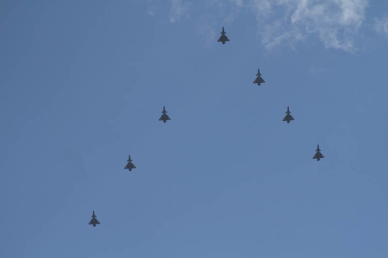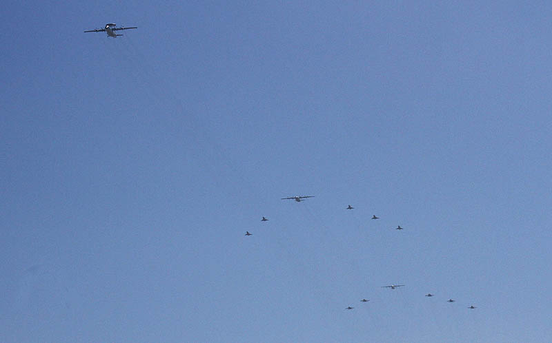 7月初旬、首都に仕事で向かう高速道路上で早速この大編隊に出会った。見事な晴天の日である。高速の路肩に車を止め編隊の一部を撮影したのが下の写真であるが、既に編隊ブロック毎に散会し始めていたので80機纏めての写真にはならなかった。