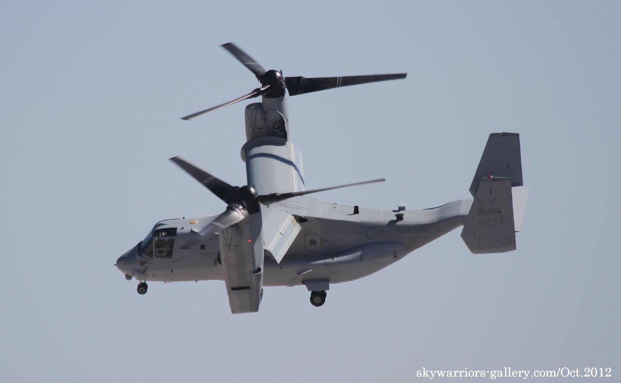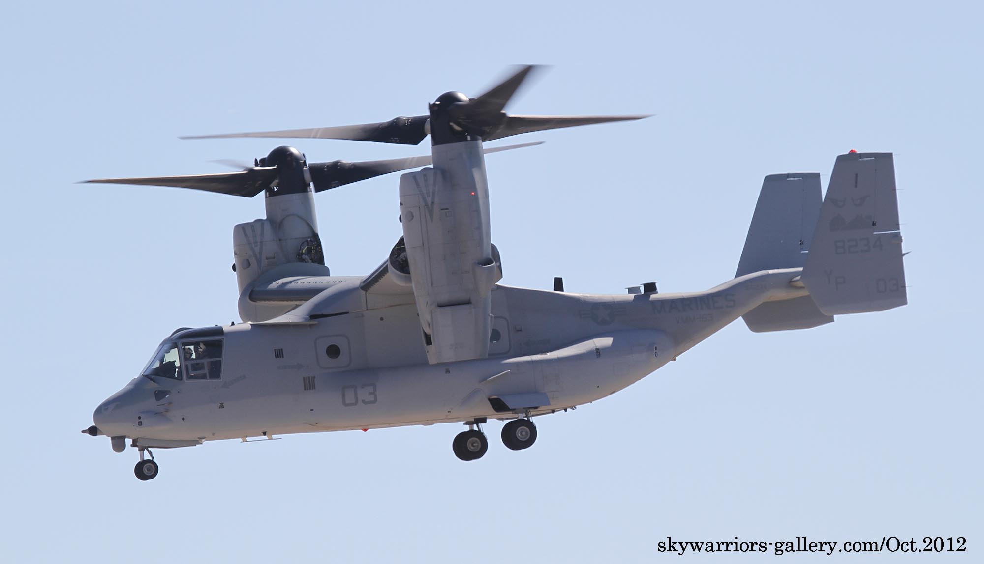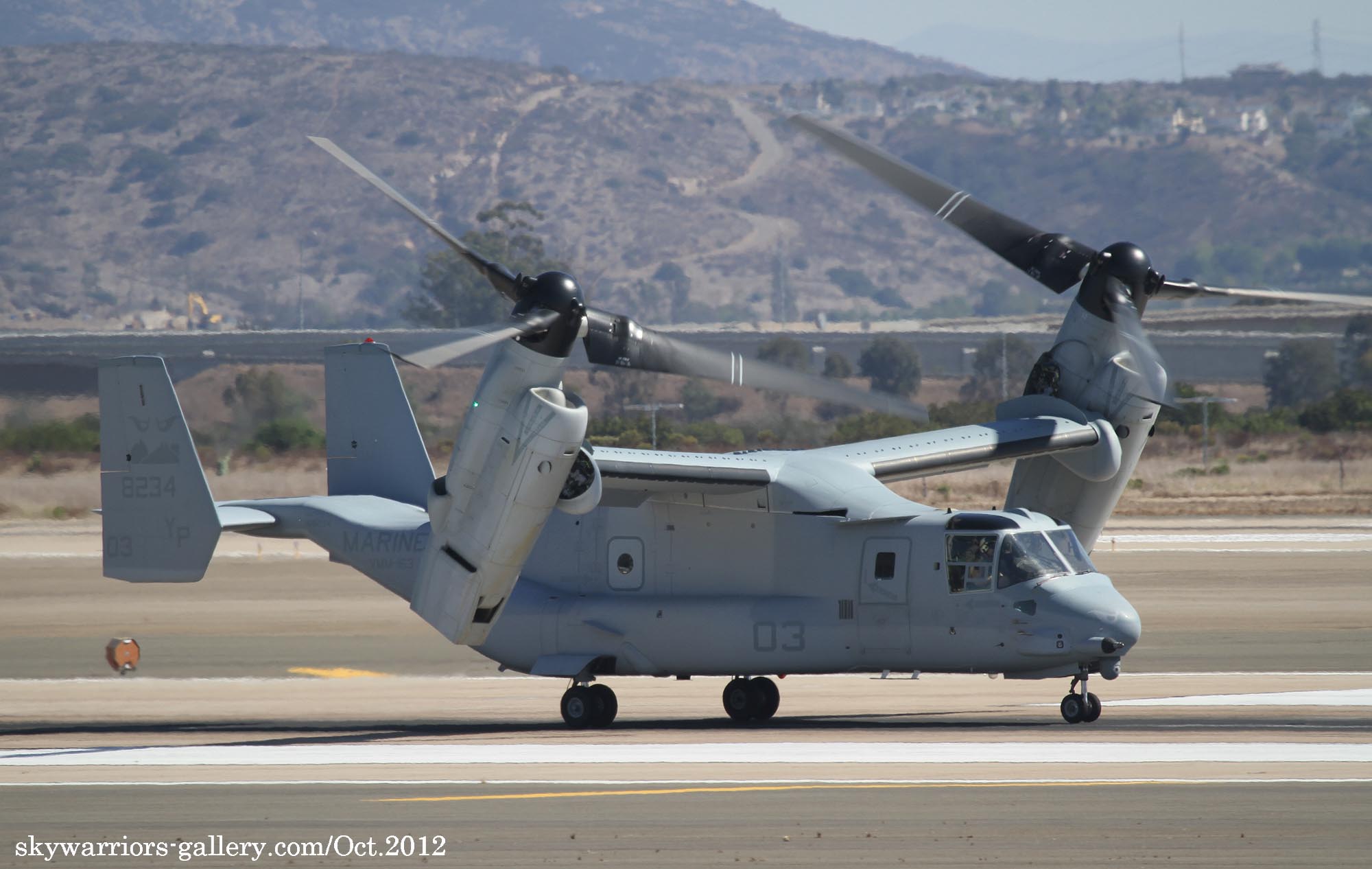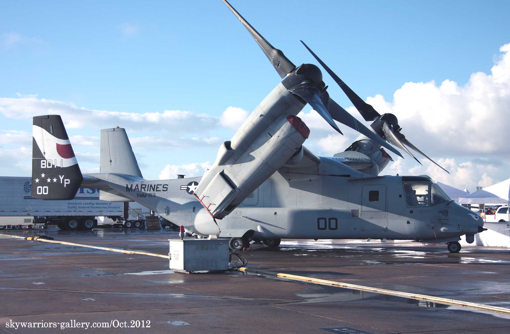 ↑ 2012年10月のミラマー基地航空ショーで地上展示された2機のVMM-163所属MV-22B。1機は隊長指定機YP-00/Bu.No.168011、もう一機は、YP-06/Bu.No.167914。この部隊の機体には伝統的に全て機首にも”邪悪な目”が描かれている。