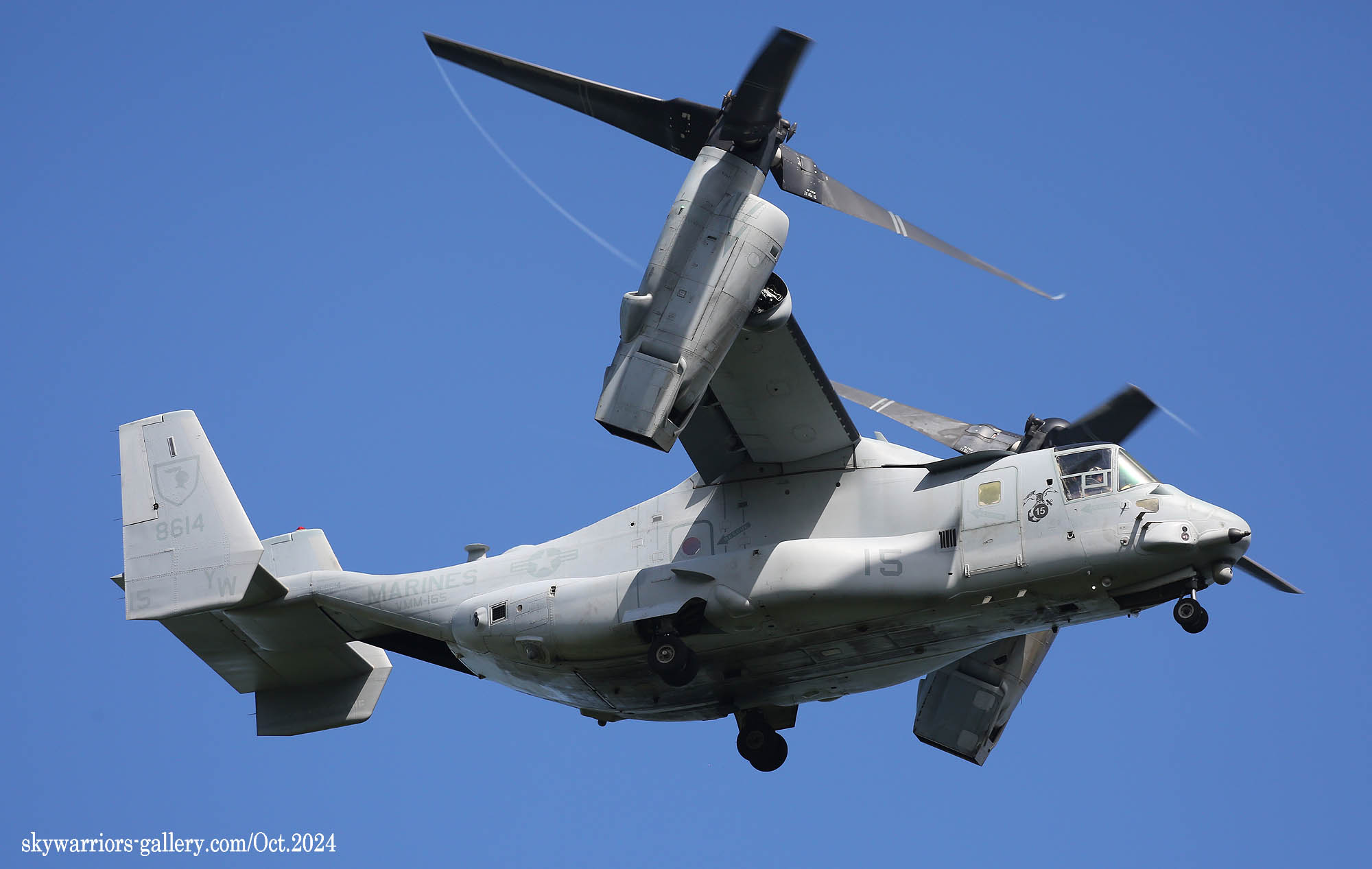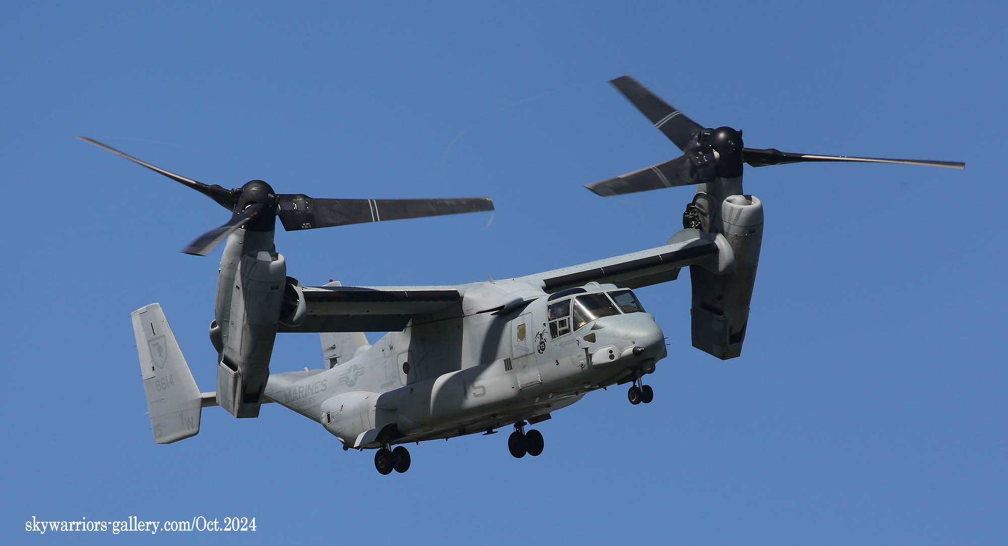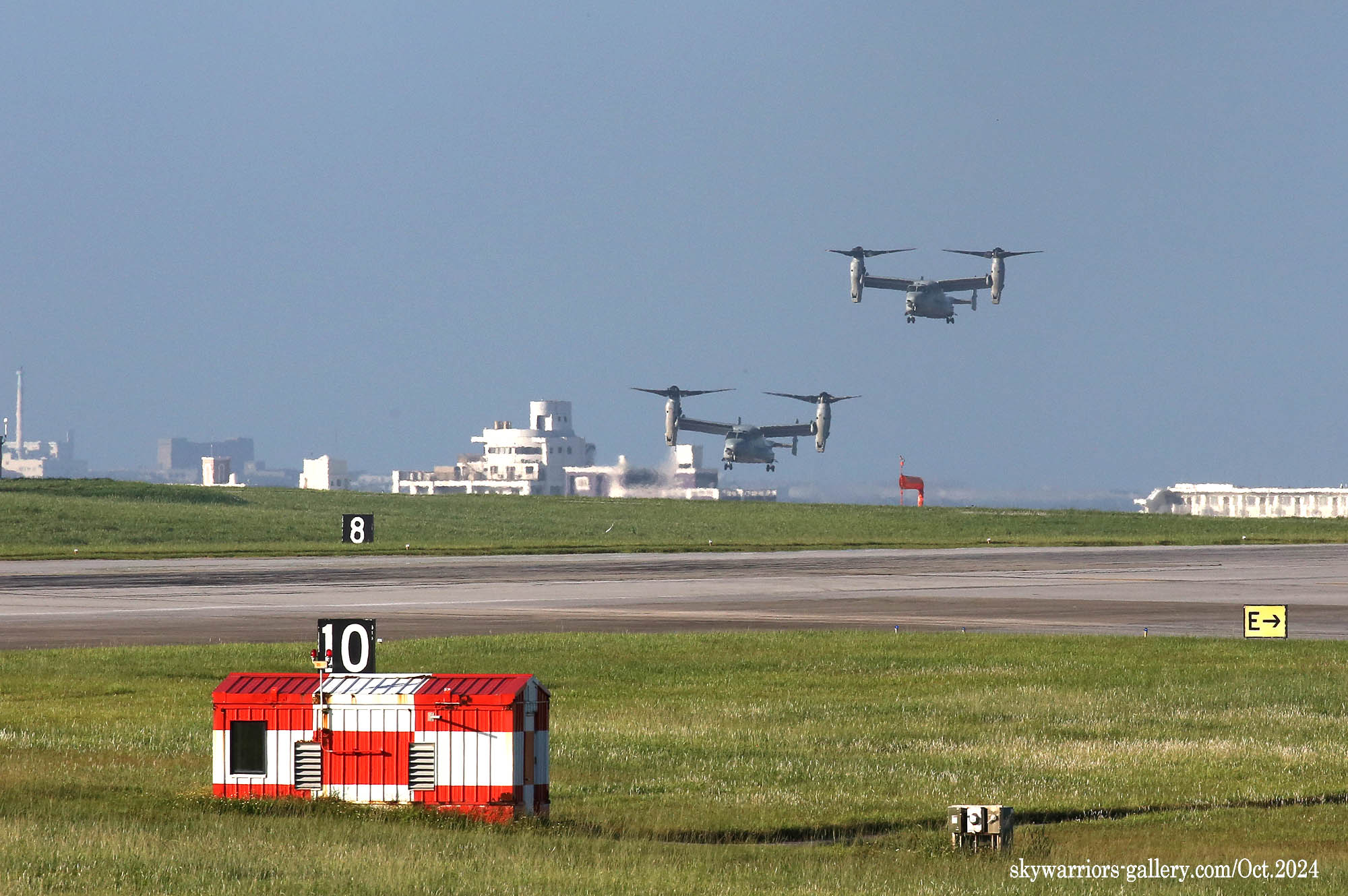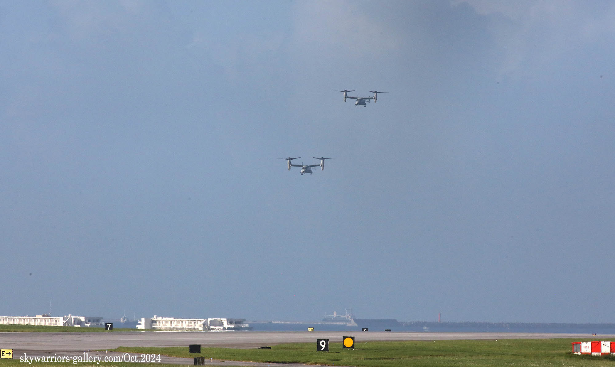 2024年10月6日普天間基地の航空祭に参加した翌日 嘉手納基地に寄ってみた。10月7日月曜日嘉手納基地に強襲揚陸艦ボクサーからMV-22飛来の無線が入った。既にアプローチに入っていた為、お墓から遠方の風景を撮ることに、約2時間後彼らは、荷物と陣を降ろして再び母艦に戻って行った。1977年初めて沖縄に来たとき、沖縄行で母艦に戻るHMH-165の一群を目にし、1978年沖縄嘉手納のこの場所で、YWのCH-46Dの飛来を目にするなど、沖縄でHMH-165との縁は深いものがあったが、またまた、たった1日の嘉手納行で彼らを撮影できるとは嬉しい限りである。(2024年10月 記)