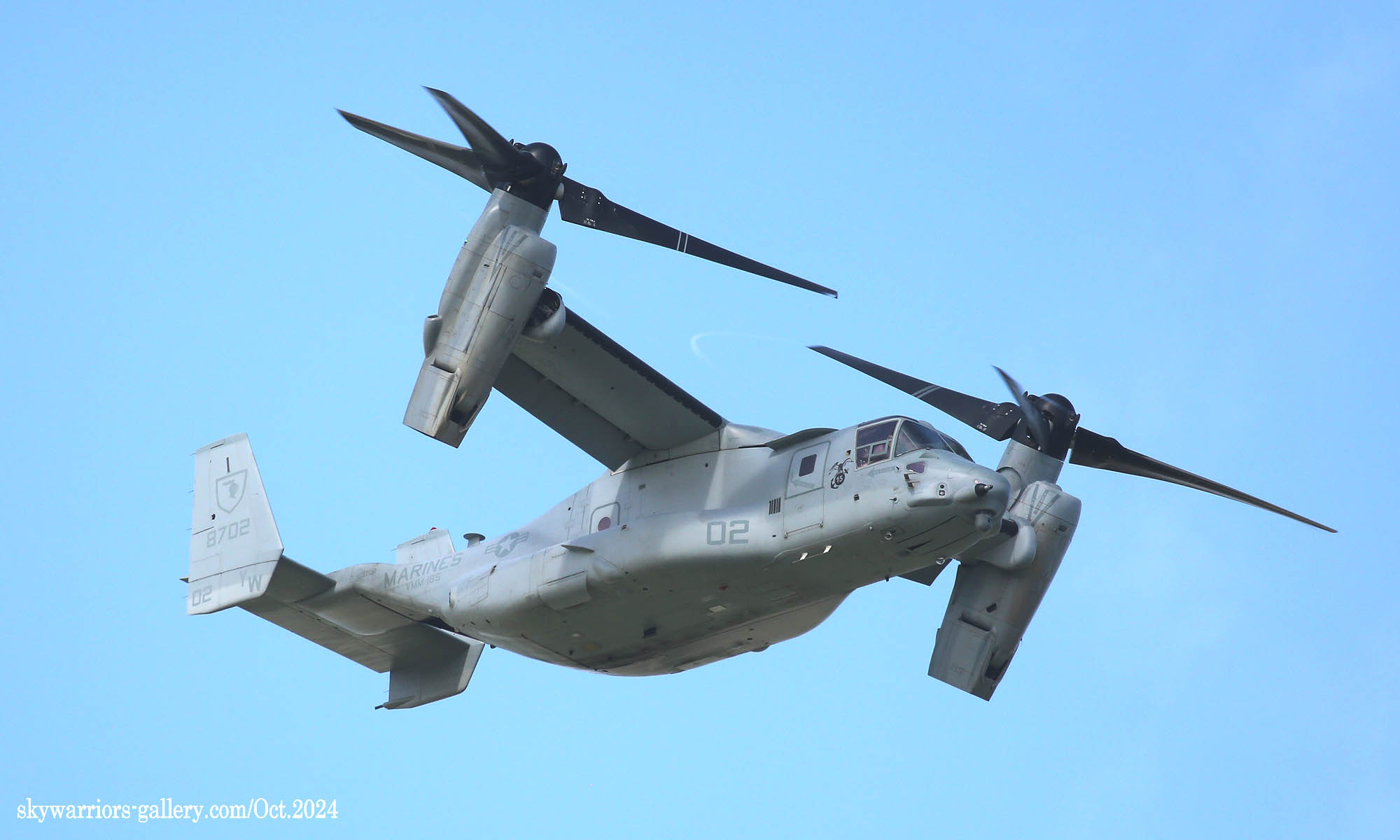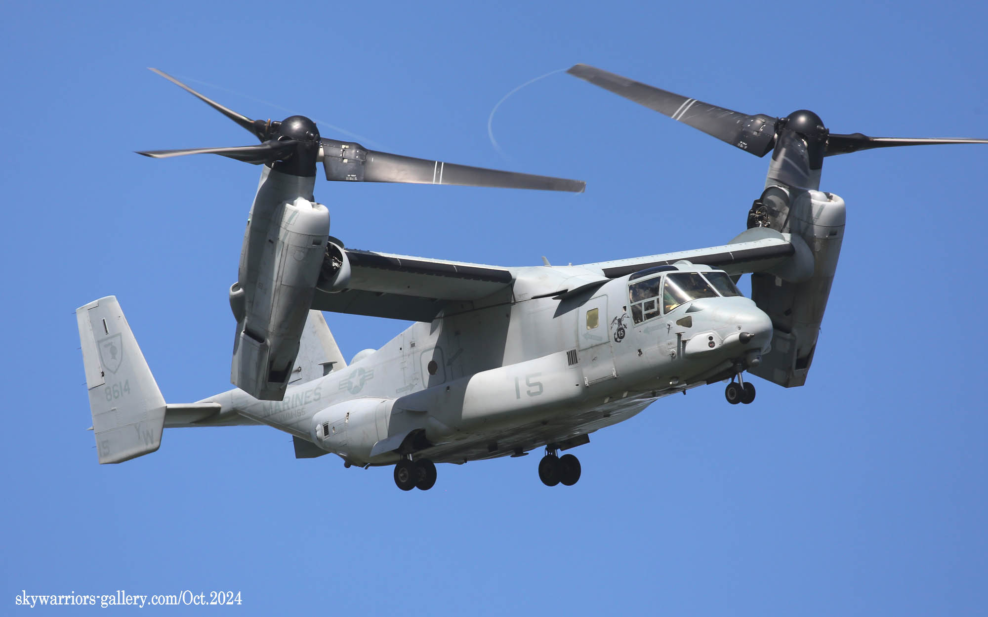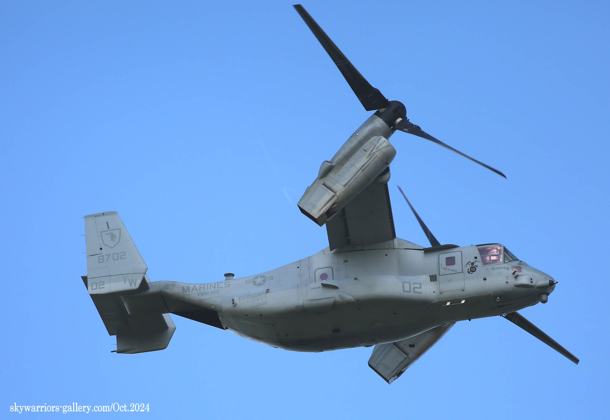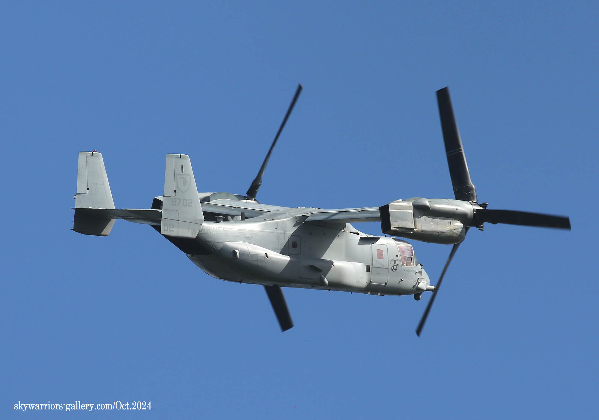 2024年10月6日普天間基地の航空祭に参加した翌日 嘉手納基地に寄ってみた。10月7日月曜日嘉手納基地に強襲揚陸艦ボクサーからMV-22飛来の無線が入った。既にアプローチに入っていた為、お墓から遠方の風景を撮ることに、約2時間後彼らは、荷物と陣を降ろして再び母艦に戻って行った。1977年初めて沖縄に来たとき、沖縄行で母艦に戻るHMH-165の一群を目にし、1978年沖縄嘉手納のこの場所で、YWのCH-46Dの飛来を目にするなど、沖縄でHMH-165との縁は深いものがあったが、またまた、たった1日の嘉手納行で彼らを撮影できるとは嬉しい限りである。(2024年10月 記)