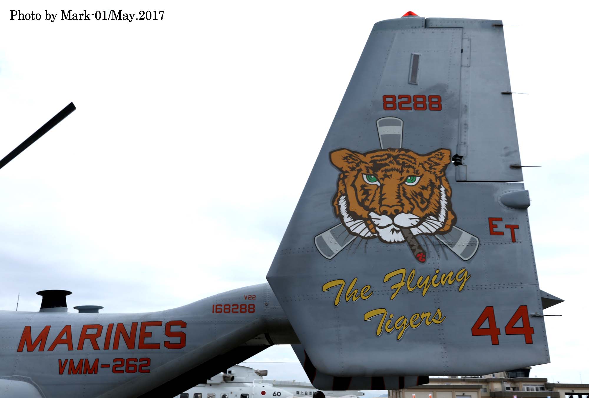 ↑2016年3月某日 厚木基地に飛来したMV-22B。デザインを変えた隊長機ET-44、虎の絵柄は、左右でデザインが異なる。