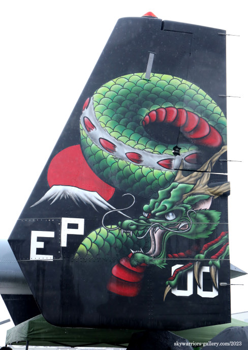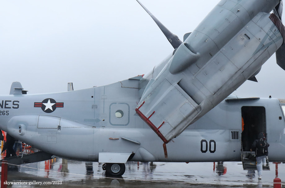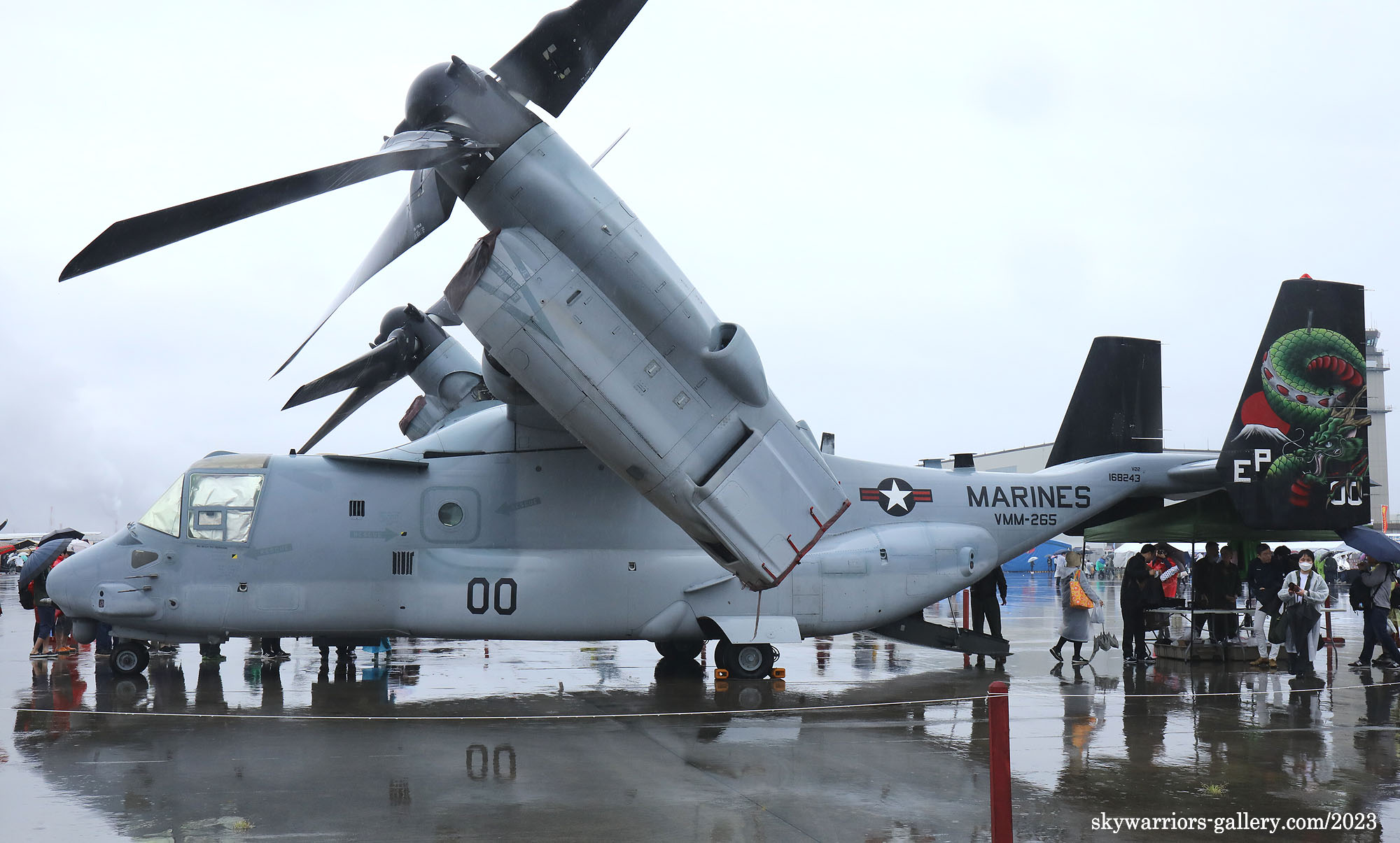 2023年4月の岩国基地航空祭、 生憎の雨の中であったがブラックテールに龍を描いたMV-22が展示されていた。