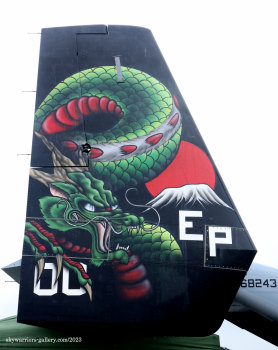 2023年4月15日 4年ぶりに開催された岩国基地祭展示機の目玉の一つがVMM-265のMV-22Bであった。隊長指定機としては恐らく3代目のマーキングになる尾翼のカラー塗装は、なんだか銭湯の壁絵か安っぽいやっちゃんの入れ墨を想像してしまうが、そうは言ってもCVW-5の面々がカラーマーキングをやめてしまった最近では、航空マニアにとって色のついた機体は貴重である。VMM-265ドラゴンズも1962年創設の飛行隊なので、昨年創設60周年を迎えた老舗飛行隊。インシグニアは、日本文字の”竜”を使っており日本人にも馴染みのイメージ、これからも末永く活躍してもらいたい。(2023年4月 記)