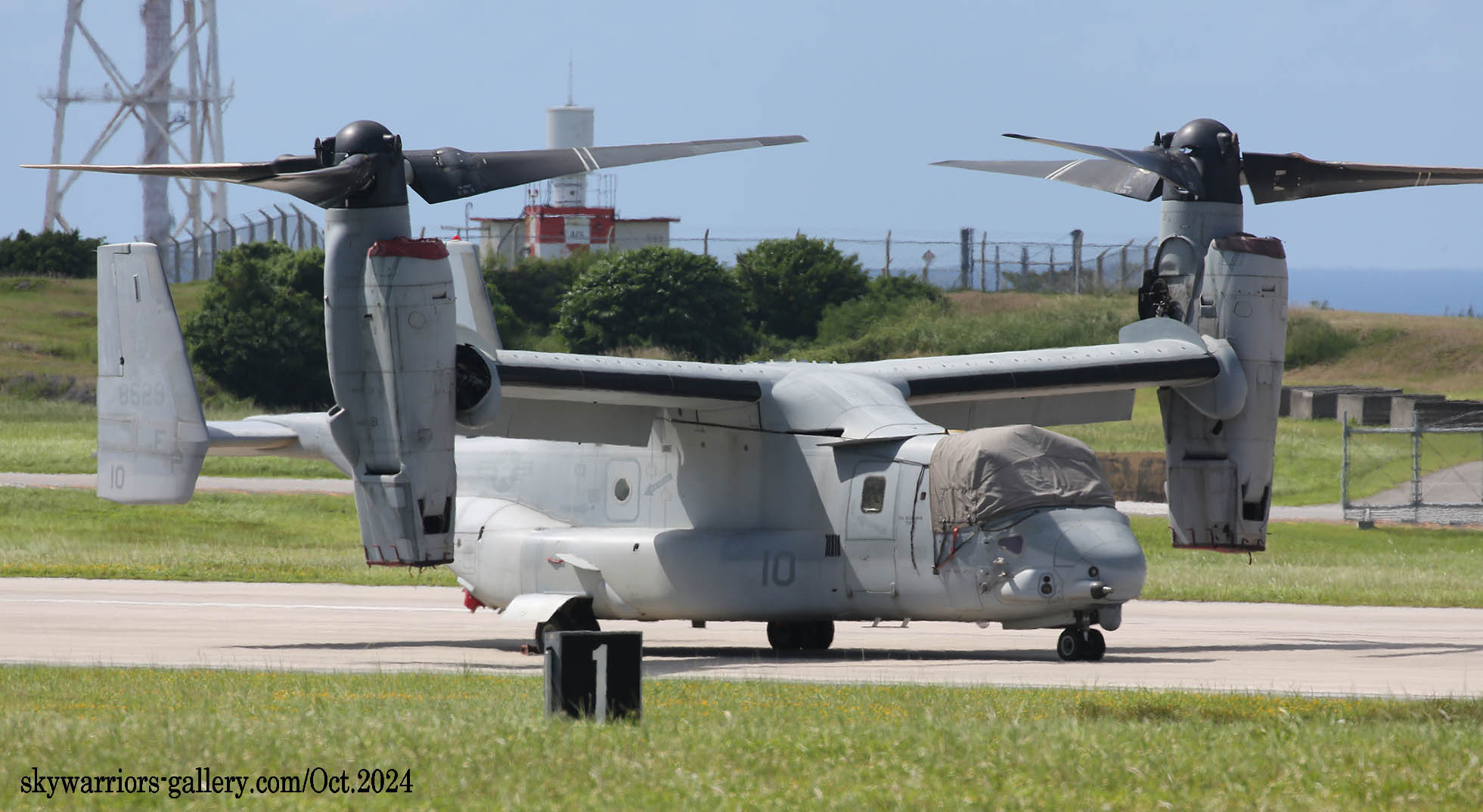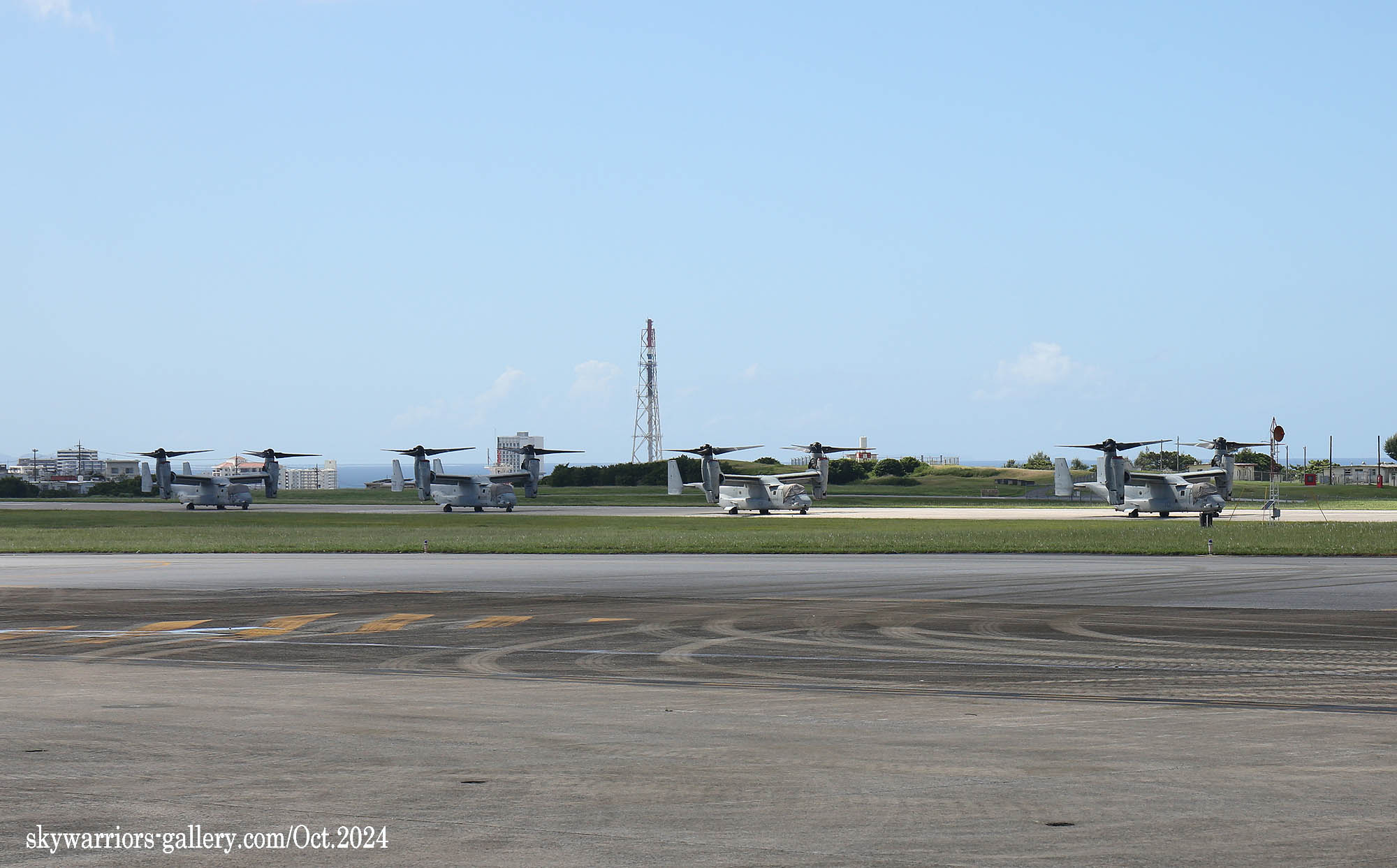 ↑ 2024年10月 普天間基地のエプロンに並ぶVMM-265のMV-22 4機。EP-10/EP-01/EP-07/EP-14の各機共に尾翼には”竜”の文字