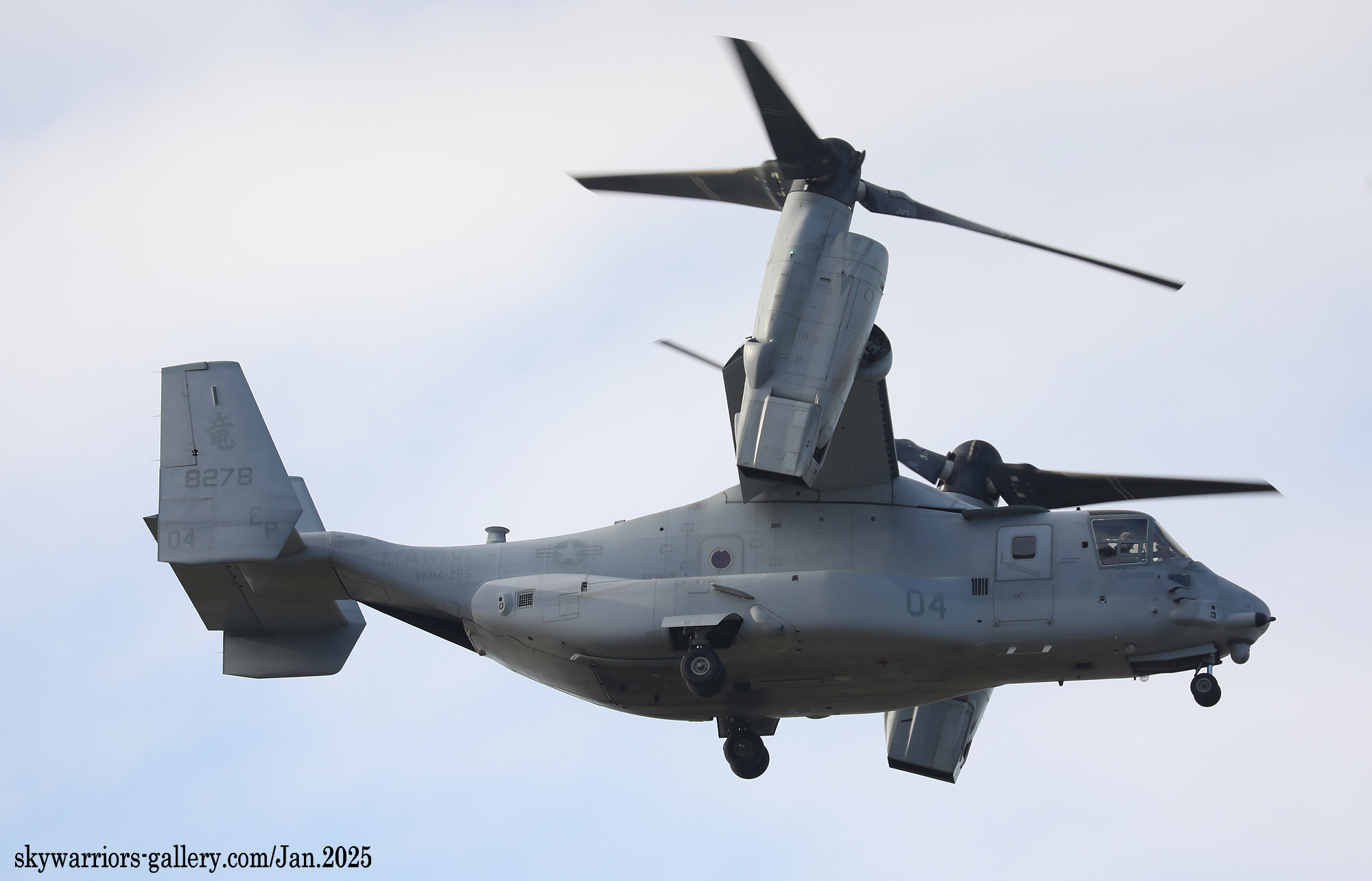 ↑ 年が変わって2025年1月 嘉手納基地上空を北部演習地に向かうVMM-265のMV-22/EP-01&EP-04。毎日数機が演習で北部に向かって飛行していたので、日を変えて普天間基地を覗きに行くことにした。
