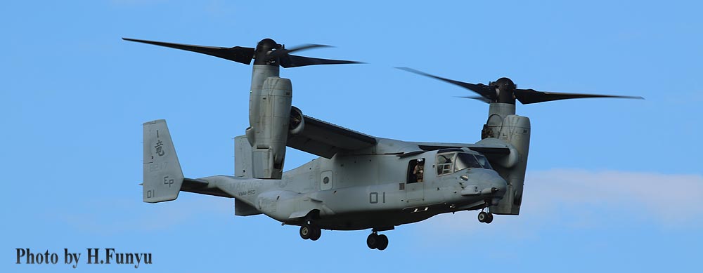 実戦化に至るまで死亡事故が目立ったので、普天間問題と絡めてすっかり政治問題化に巻き込まれたMV-22B。岩国から最後の1陣が普天間基地に飛び立つまで、地上波放送で実況中継が入るなんて写真マニアもあっと驚きの報道過熱ぶりであった。2012年10月1日本来、出向先の某国から沖縄直行するはずだった飛行機が某国政府の妨害?(乗客が 尖閣問題で激減の為)によりドタキャンされ、成田経由の強行スケジュールとなった。自宅から羽田に向かうその朝、テレビが盛んに岩国基地のオスプレーのフライトを実況していたため、いつ移動するのか全く知らなかった私も「上手くすれば沖縄で撮れるかも・・・」なんて 虫の良い考えが頭を過ったのである。