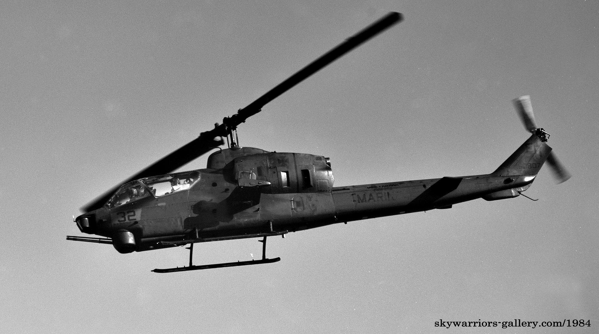 1971年にカルフォルニア州ペンデルトンで創設された海兵隊の軽ヘリコプター飛行隊であるが、”軽”と言うよりは攻撃ヘリ部隊と言った方が判りやすい。テールレターは”SN”である。1980年代当時、日本本土で撮影できたAH-1は、統合遠征部隊(Rein)の形で派遣されることが多かったので、”SN”のレターを付けたまま飛ぶ事はまれである。従ってHMLA-169所属であっても本当にそうなのか判断が難しい。但し、Rein部隊の傘下にあっても、この飛行隊のシンボルマークであるバルケンクロイツを描いたまま飛行している姿は、何度も目撃されており、比較的原隊を判別しやすい飛行隊だった。とは言ってもAH-1自体の撮影機会は多くなく、従って此処でご紹介できる写真も少ないのが現状なのだ。