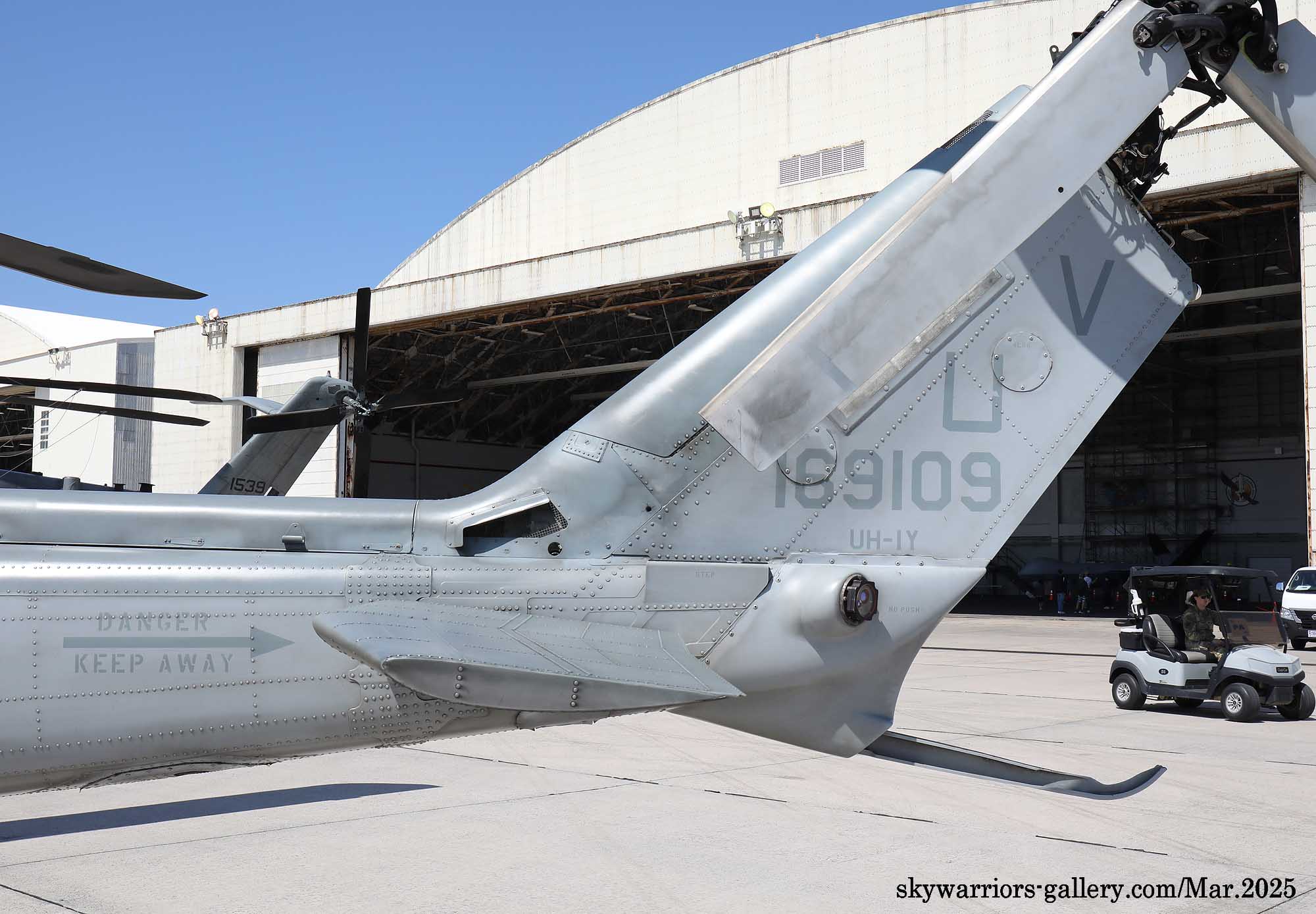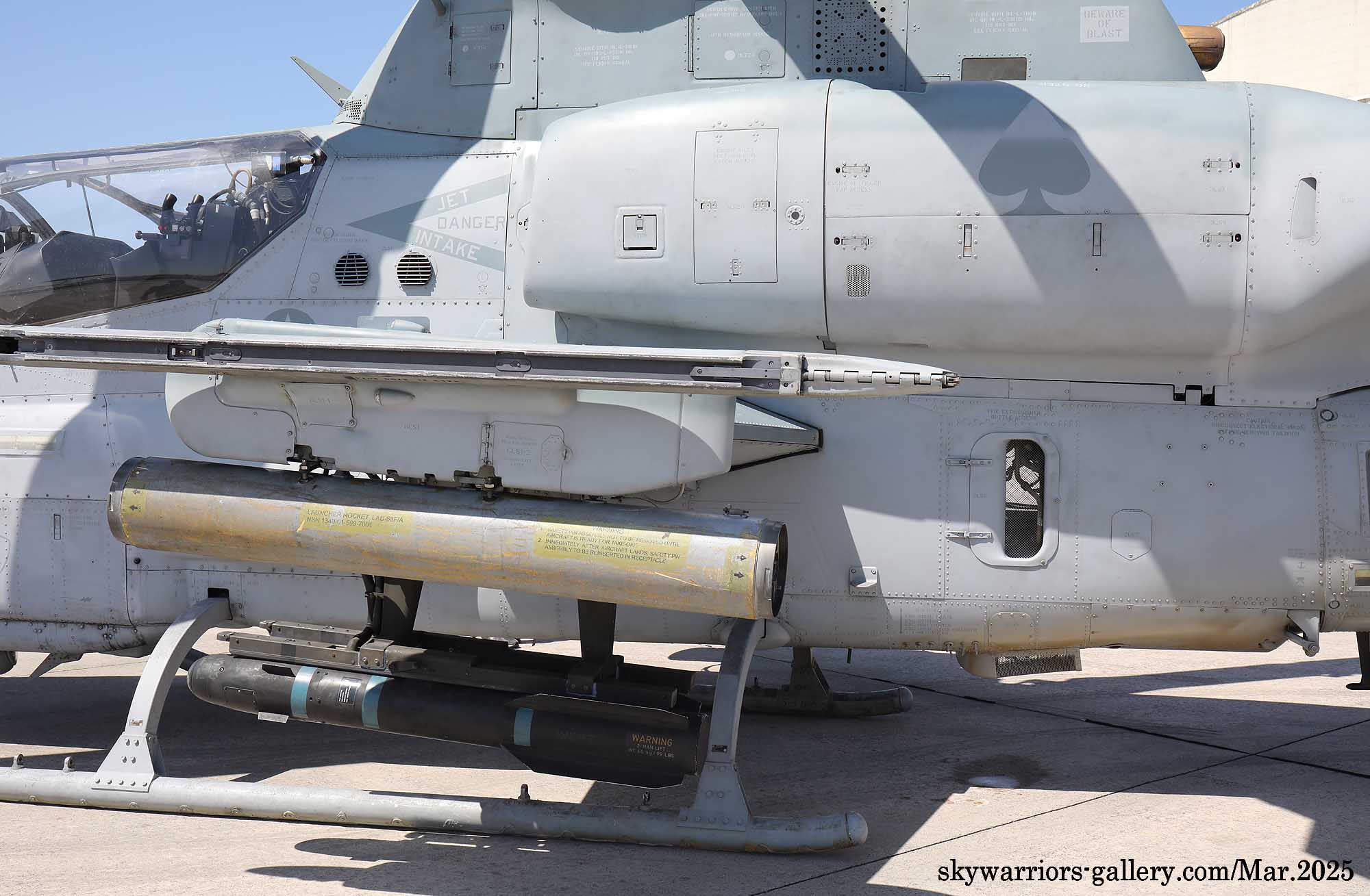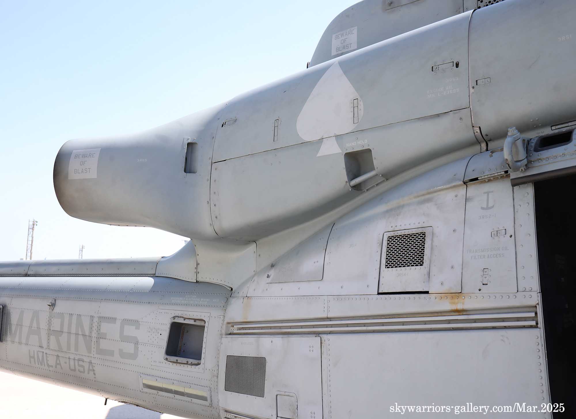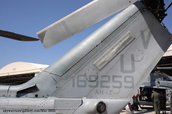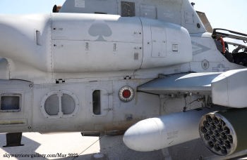 ↑ HMLA-267のトレードマークであるスペードがエンジンカバーに書かれているが、最近普天間基地に駐留するHMLA-各部隊は、テールコードをオリジナルのものを使うようになり原隊が判り易くなった。Y型の排気ダクトはAH-1Zと共通で、周辺の空気を取り込んで排気の温度を下げる特殊な機構を持っている。