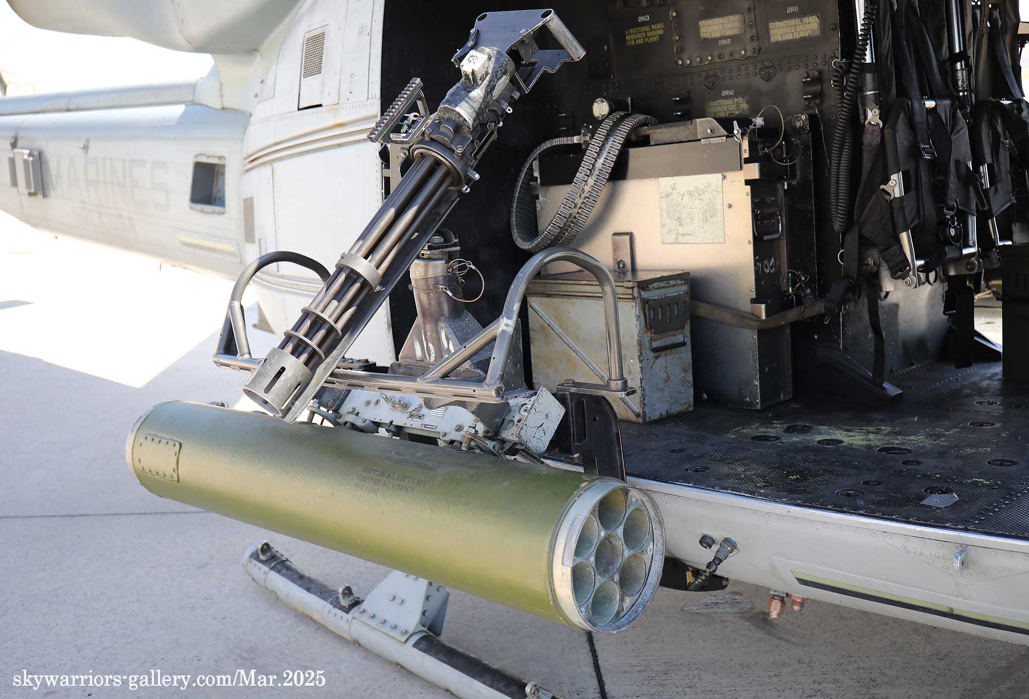 ↑ UH-1Yベノムの右側面に装着されたロケットランチャーは、2.75インチロケット弾7連装のLAU-68D/A。機関銃の方は、7.62㎜NATO弾を使えるGAU-17/Aとミニガン思われる。奥に見える大きな箱は弾倉であるが、毎分最低でも2000発以上撃てる本機関銃では、瞬く間に弾が消耗する。戦闘機に付けられていた20㎜バルカン砲の設計をダウンサイズしたもので、それ故ミニガンと呼ばれる。