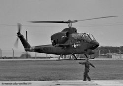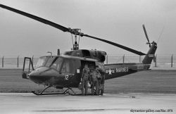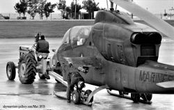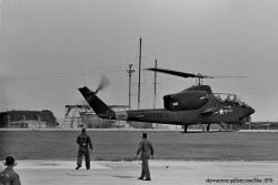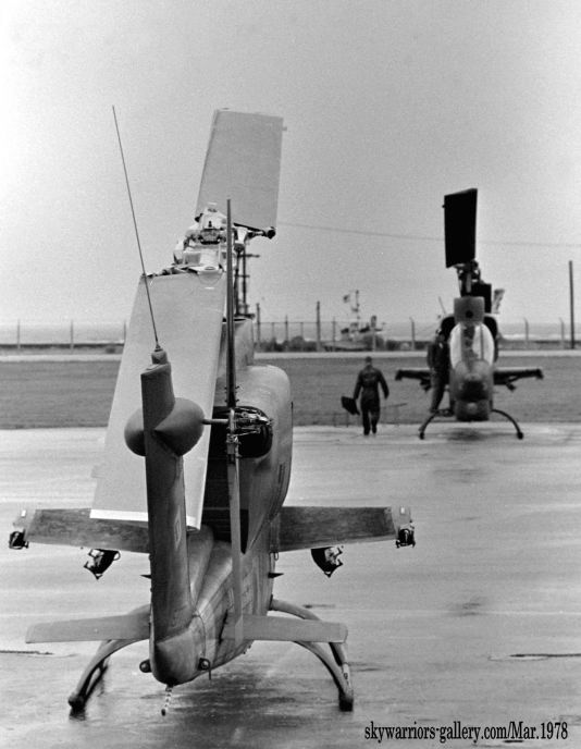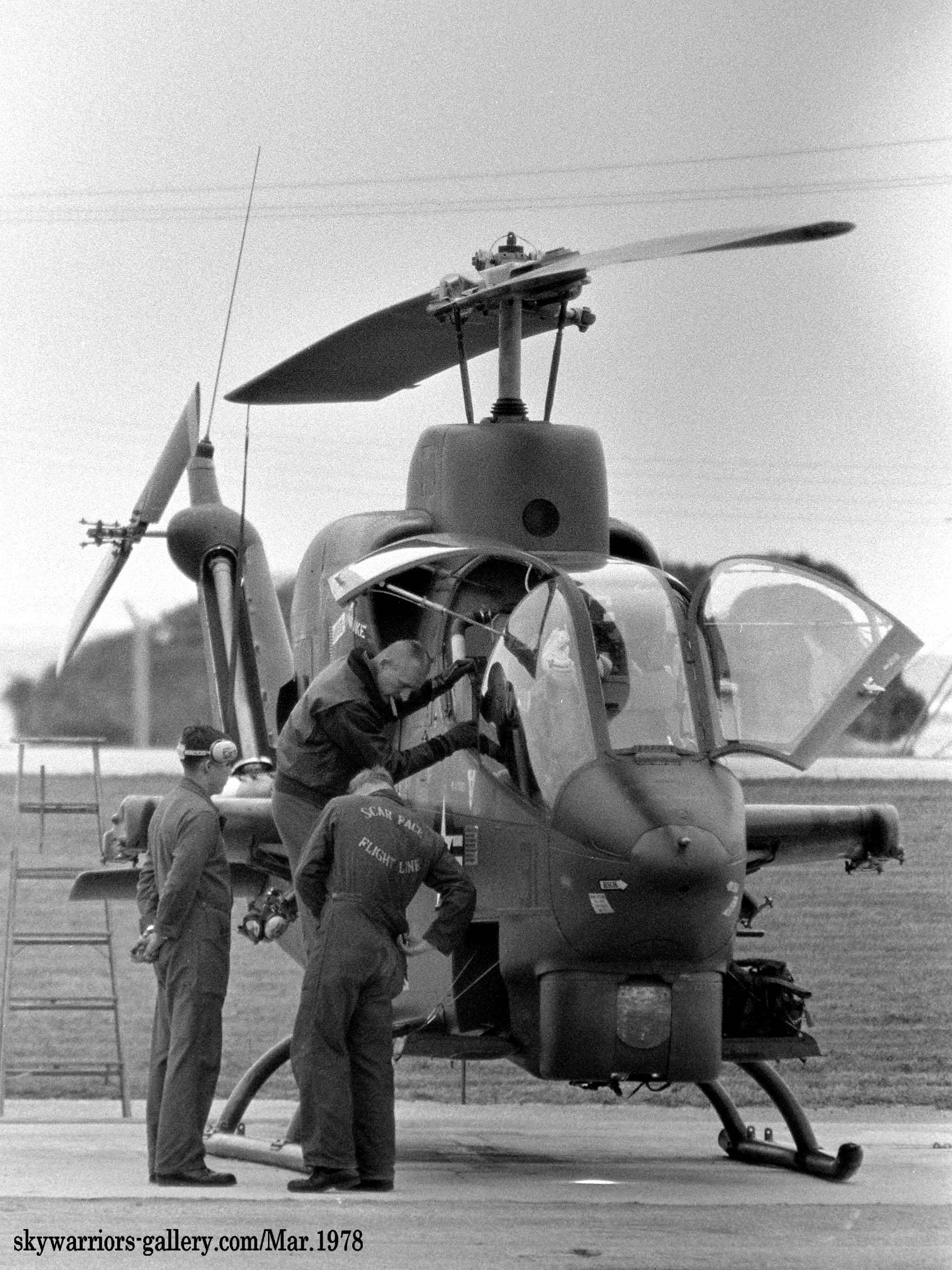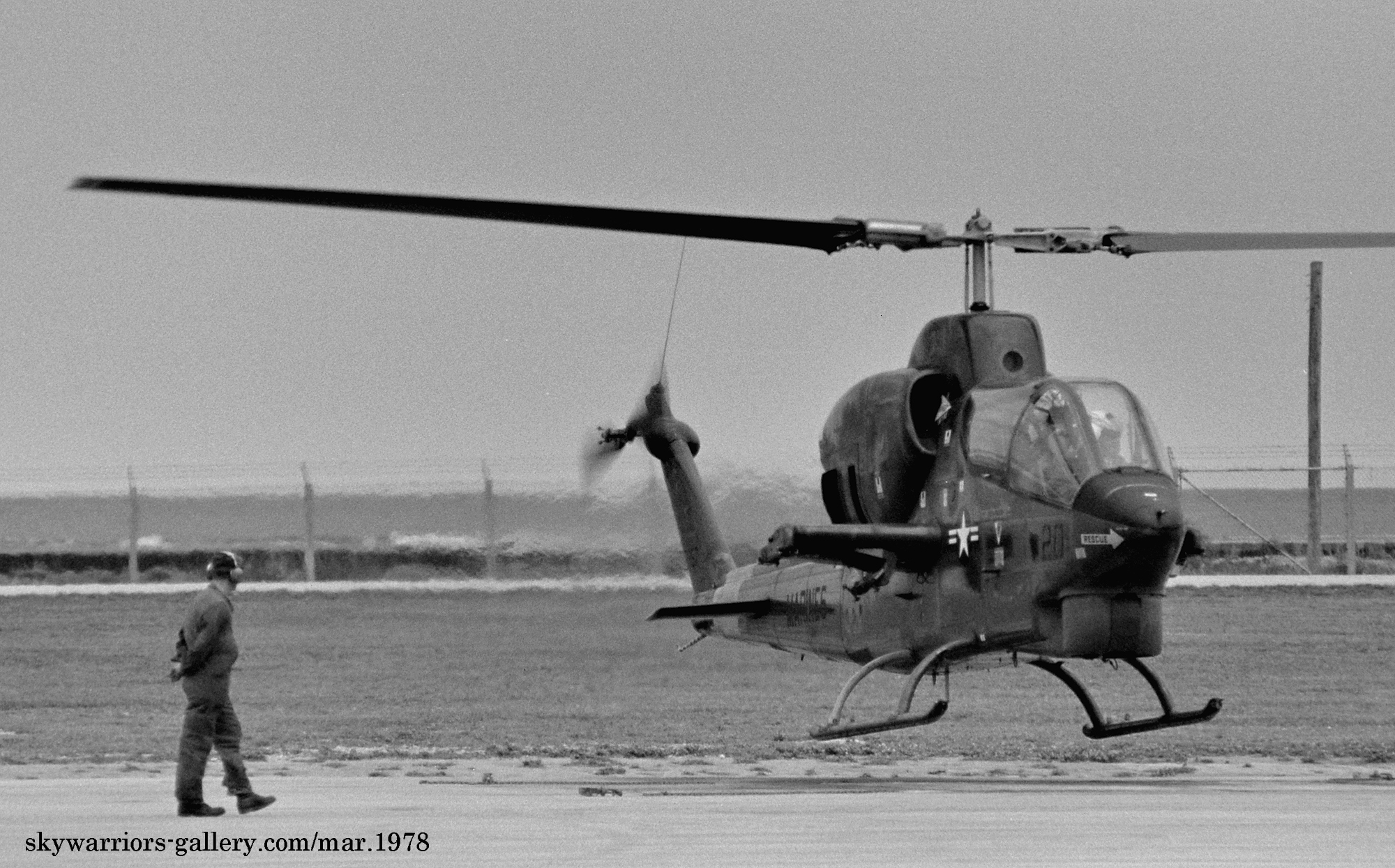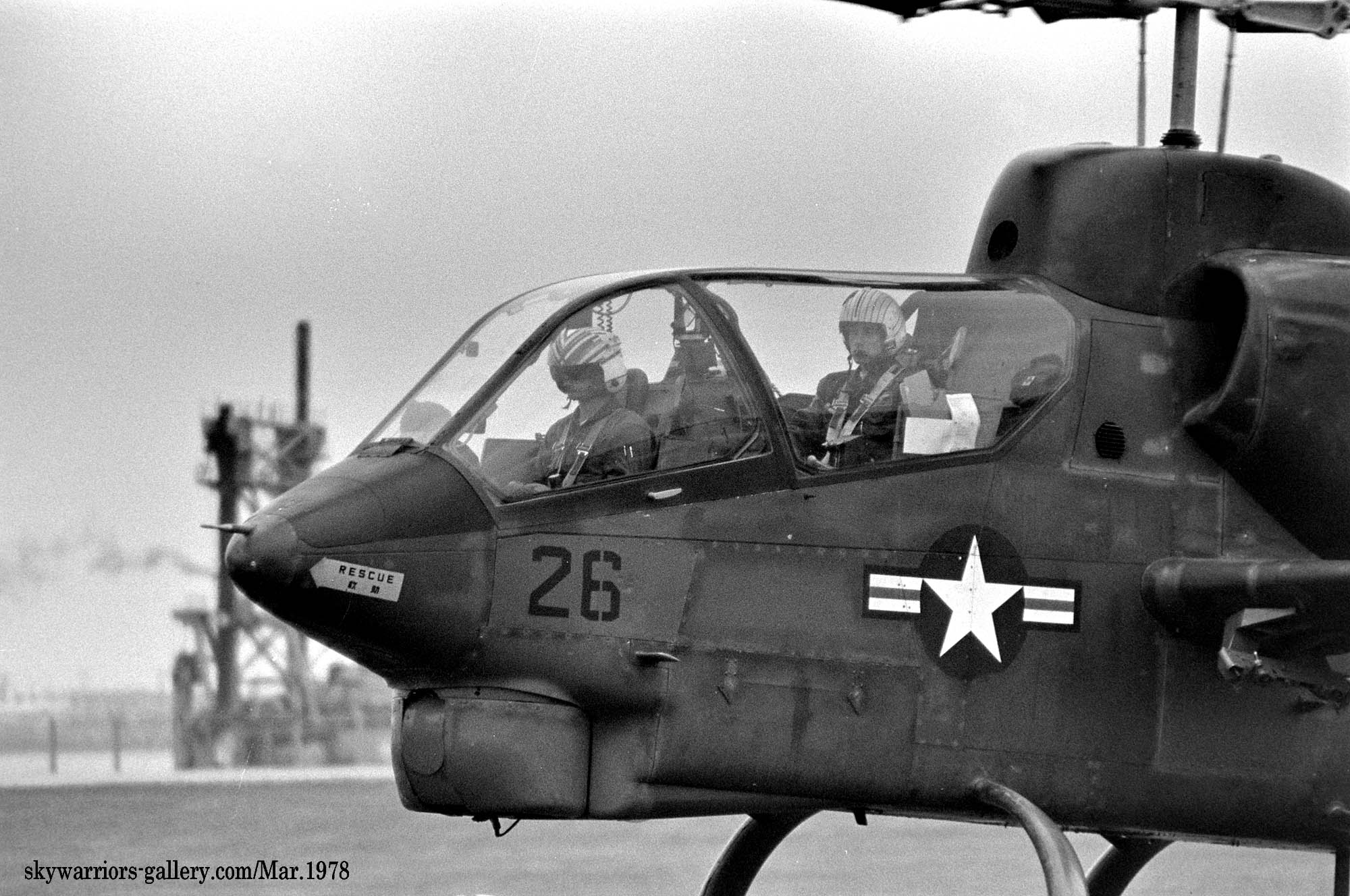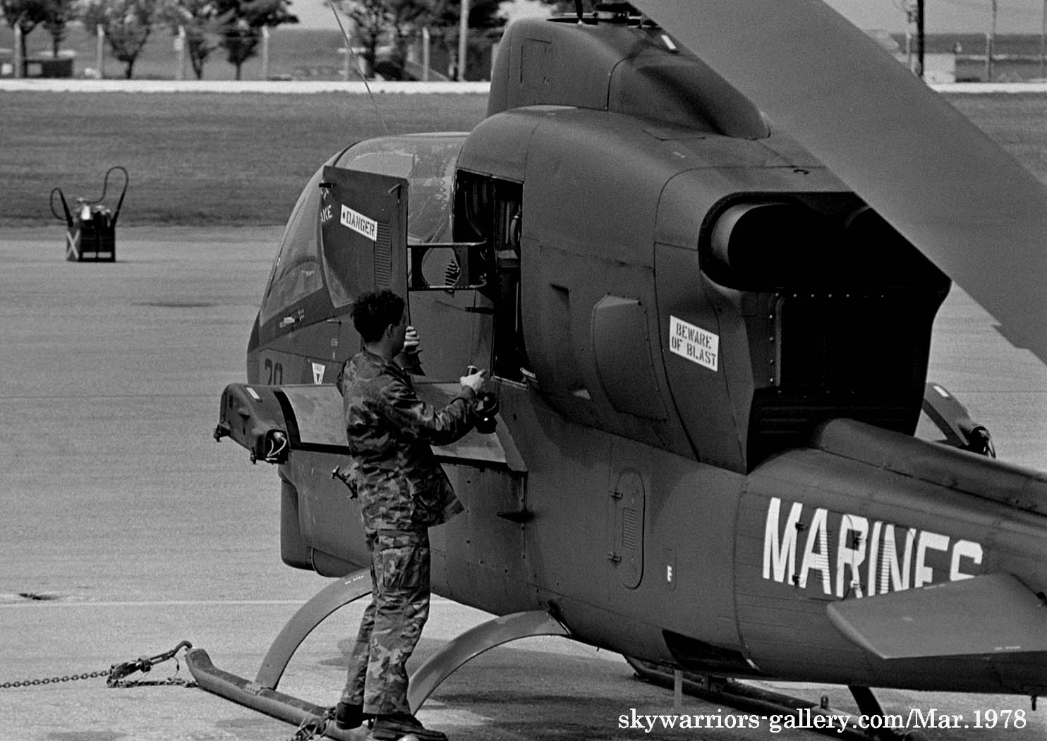 ↑ ハンビー飛行場でホバリングから地上すれすれでの飛行訓練を行うAH-1J/VT-26。機首の注意書は英語と漢字表記が併記されていて、海兵隊らしい・・・ヘルメットは個人で好みのデザインが出来たようで、髑髏マークを付けたヘルメットも散見された。