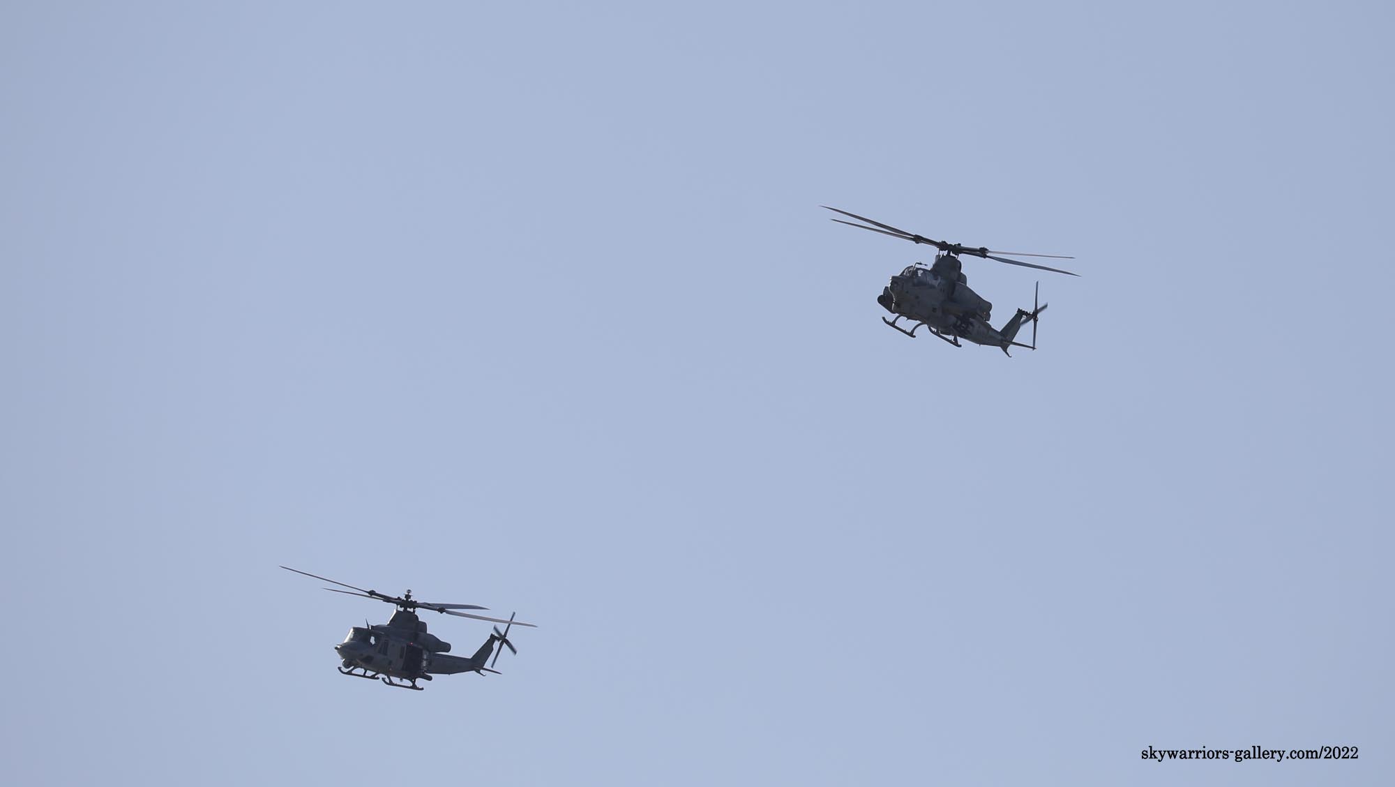 ↑ 2022年3月8日ペアで嘉手納に向かうAH-1ZとUH-1V。AH-1Zは、ご覧の通りヘルファイアーとロケット弾ポッドを付けている。”SM-44” BU.No.不明
