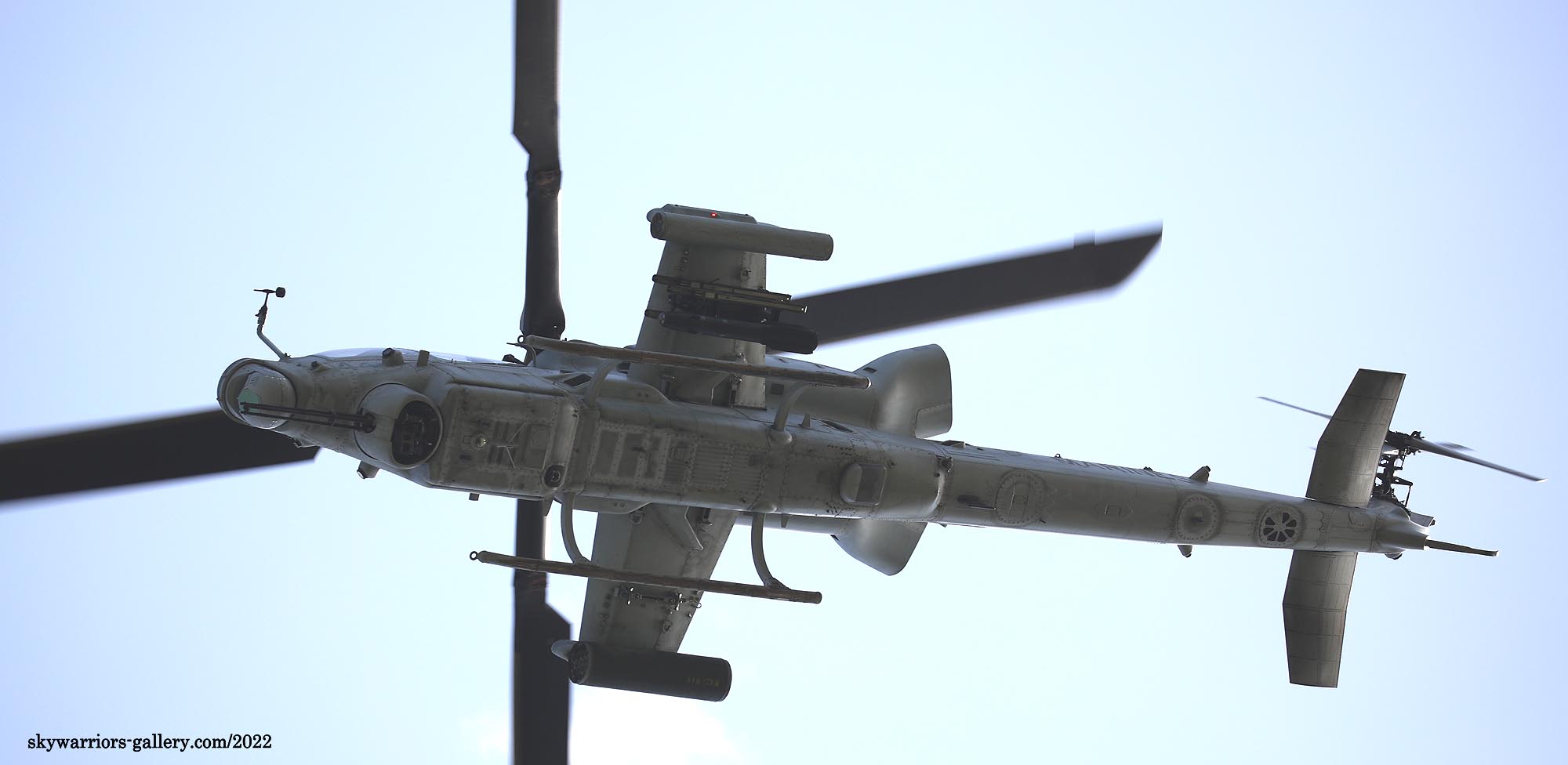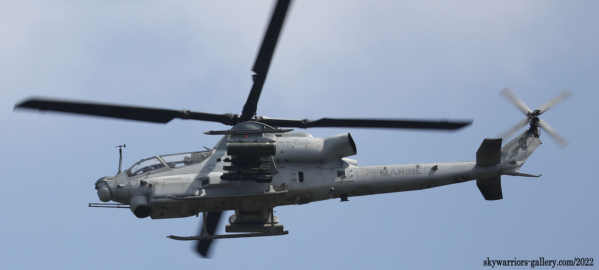 ↓ 2022年3月9日、普天間から嘉手納に向かうAH-1Zバイパー。Bu.No.162259 ”SM-47” ターレットには、対地ミサイルヘルファイアーとハイドラ・ロケット弾ポッドを携行している。