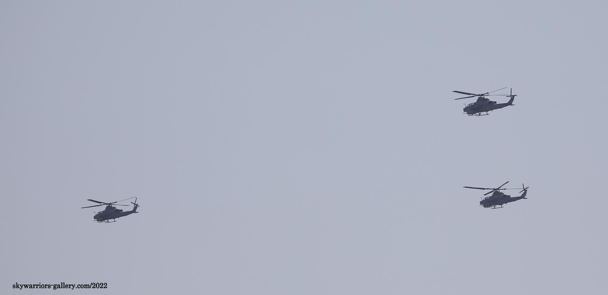 ↑ 2022年3月9日 3機編隊で北部射撃場から普天間基地に帰投するHMLA-369のAH-1Z 3機。基地に