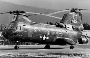 CH-46F後部テールローターエンジンカバーに描かれた虎の顔が、当時 妙にリアル感があったが、遠くから見ると羽を広げた蝶のように見えたものである。